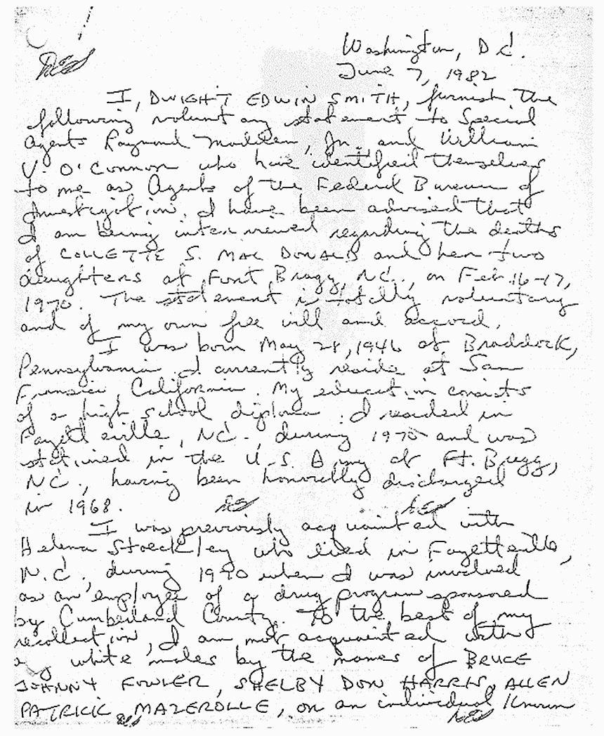 I, Dwight Edwin Smith, furnish the following voluntary statement to Special Agents Raymond Madden, Jr., and William V. O'Connor who have identified themselves to me as Agents of the Federal Bureau of Investigation. I have been advised that I am being interviewed regarding the deaths of Collette [sic] S. Mac Donald and her two daughters at Fort Bragg, N.C., on February 16-17, 1970. The statement is totally voluntary and of my own free will and accord.