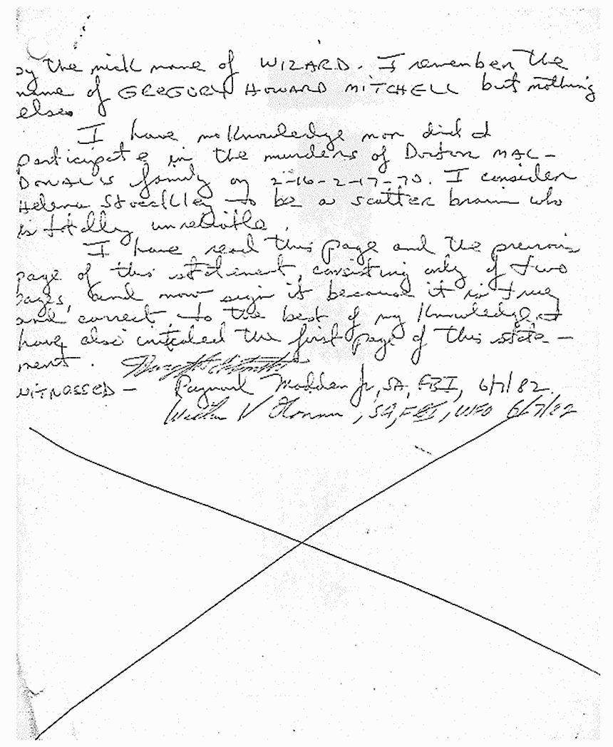 I have no knowledge nor did I participate in the murders of Doctor MacDonald's family on 2-16-2-17-70. I consider Helena Stoeckley to be a scatterbrain who is totally unreliable.