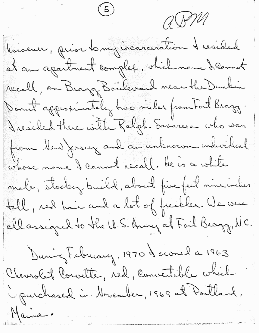 "During the month of February 1970 I was incarcerated at the Fayetteville jail, however, prior to my incarceration I resided at an apartment complex, which name I cannot recall, on Bragg Boulevard near the Dunkin Donut approximately two miles from Fort Bragg. I resided there with Ralph Savarese who was from New Jersey and an unknown individual whose name I cannot recall. He is a white male; stocky build; about five feet, nine inches tall; red hair and a lot of freckles. We were all assigned to the U. S. Army at Fort Bragg, N. C.
