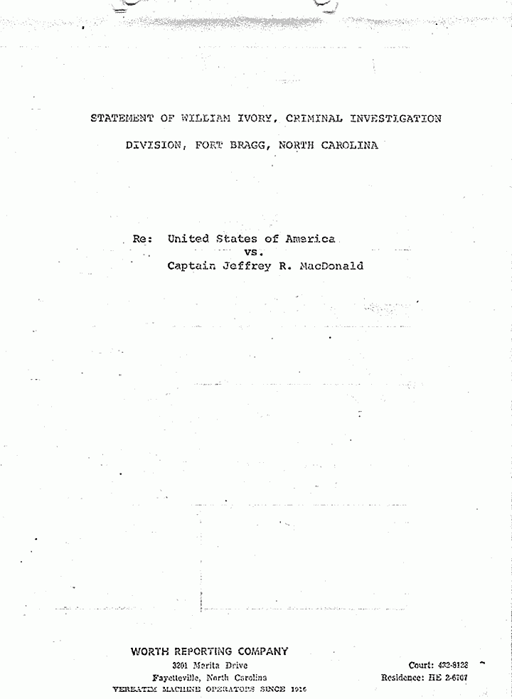 STATEMENT OF WILLIAM IVORY, CRIMINAL INVESTIGATION DIVISION, FORT BRAGG, NORTH CAROLINA