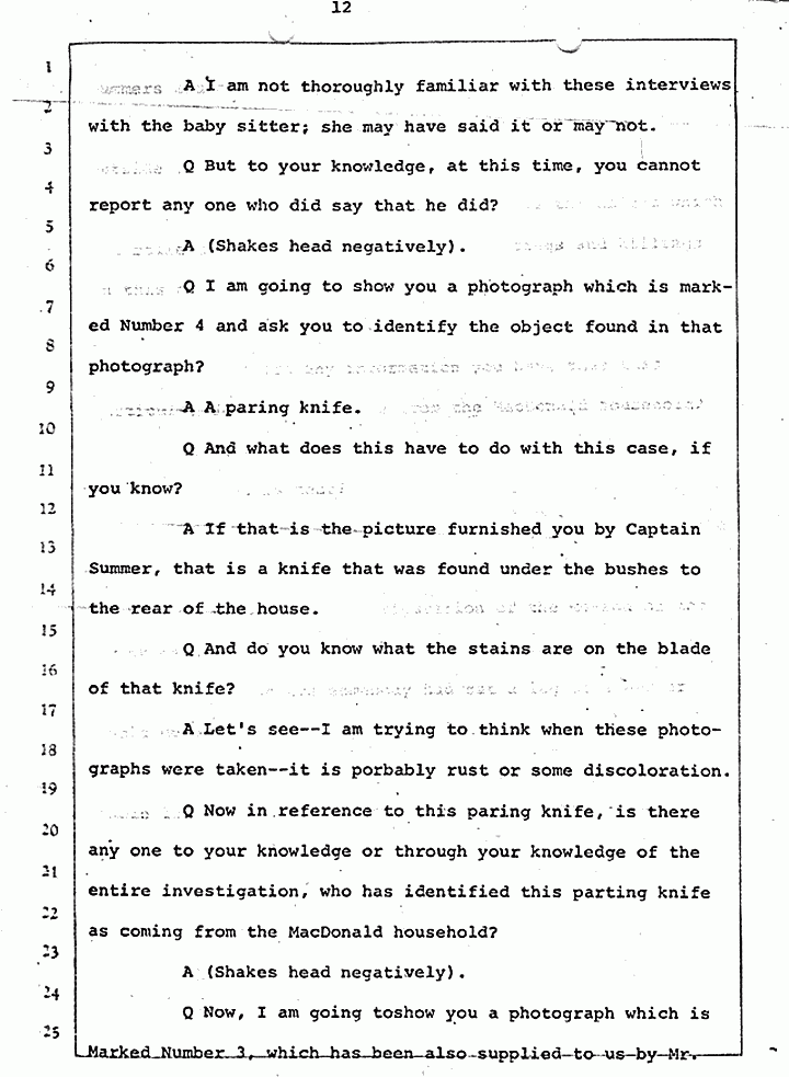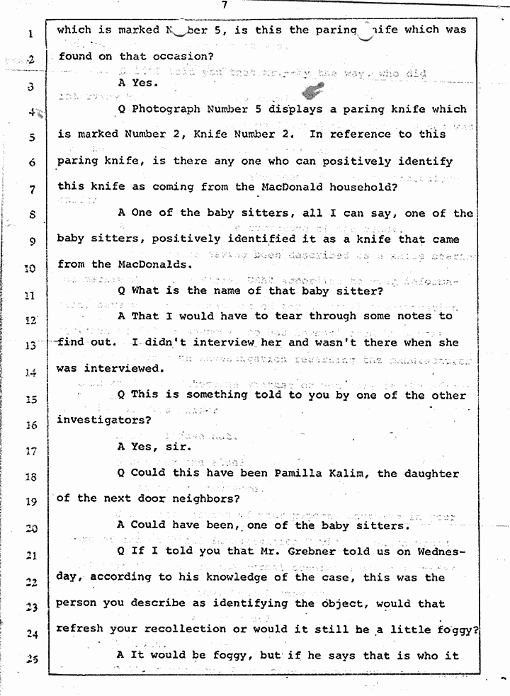 Q Photograph Number 5 displays a paring knife which is marked Number 2, Knife Number 2. In reference to this paring knife, is there anyone who can positively identify this knife as coming from the MacDonald household?