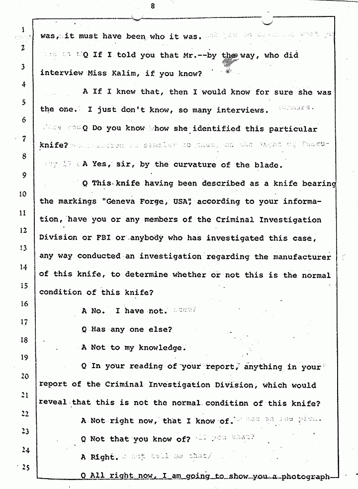 Q This knife having been described as a knife bearing the markings "Geneva Forge, USA," according to your information, have you or any members of the Criminal Investigation Division or FBI or anybody who has investigated this case, any way conducted an investigation regarding the manufacturer of this knife, to determine whether or not this is the normal condition of this knife?
