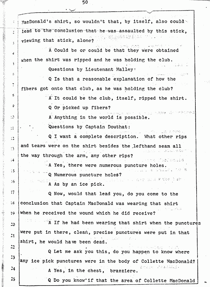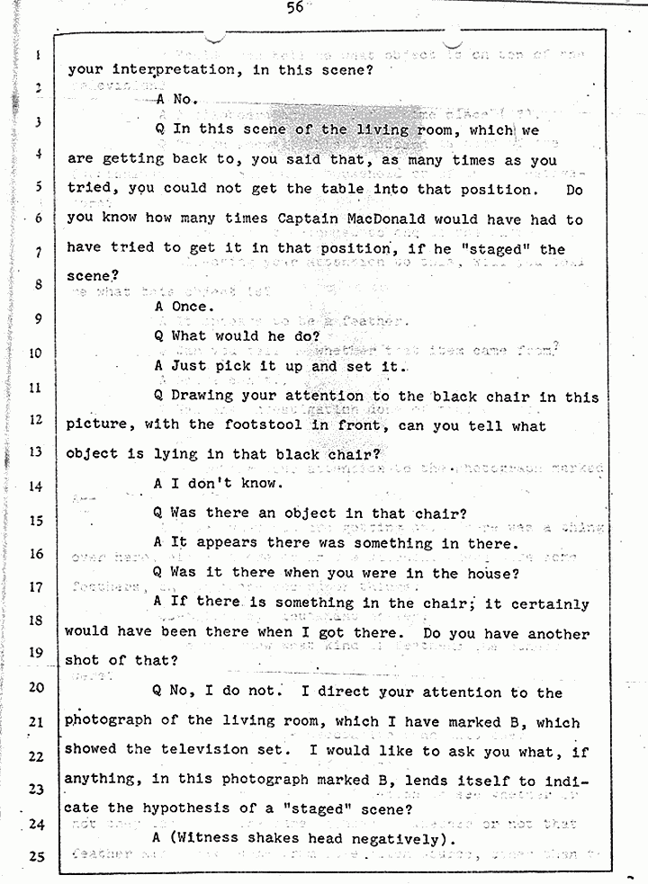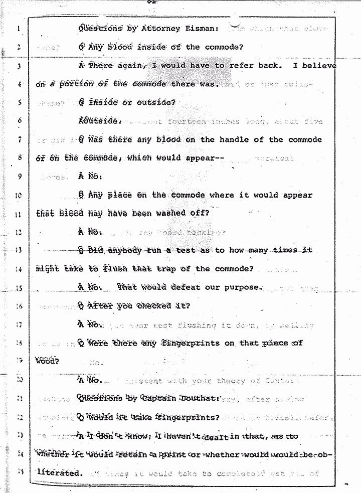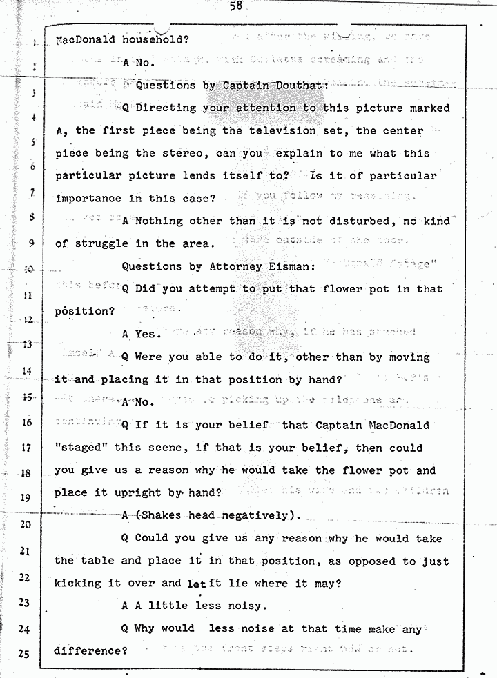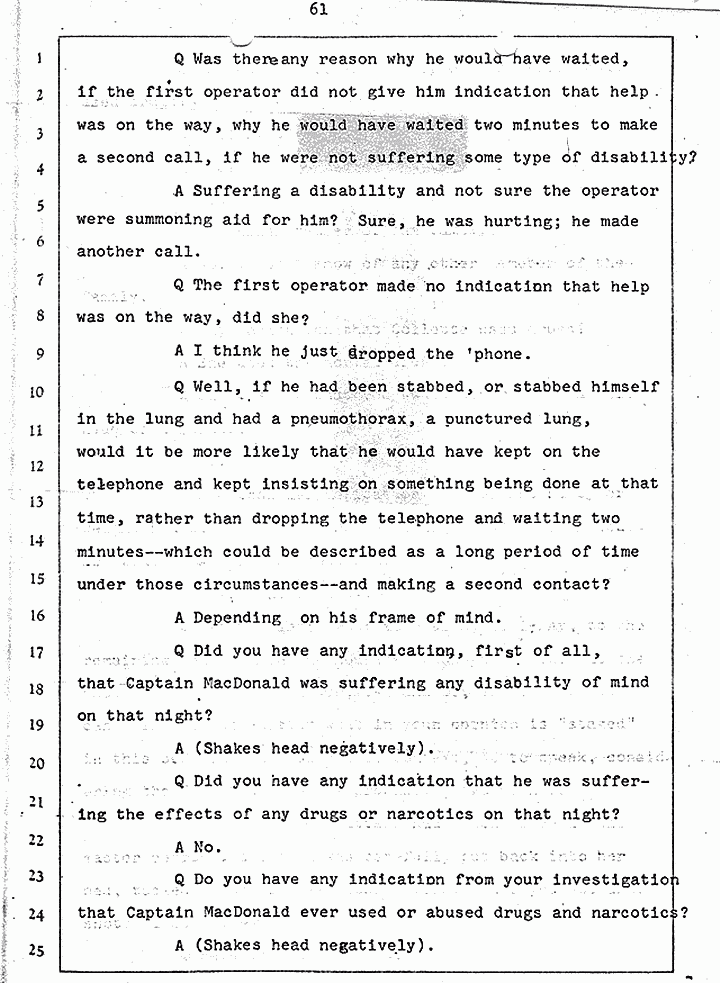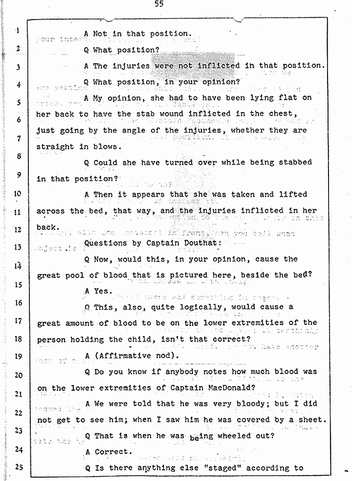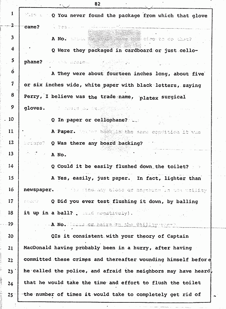 Q Is it consistent with your theory of Captain MacDonald have probably been in a hurry, after having committed these crimes and therefore wounding himself before he called the police, and afraid the neighbors may have heard, that he would take the time and effort to flush the toilet the number of times it would take to completely get rid of this evidence?