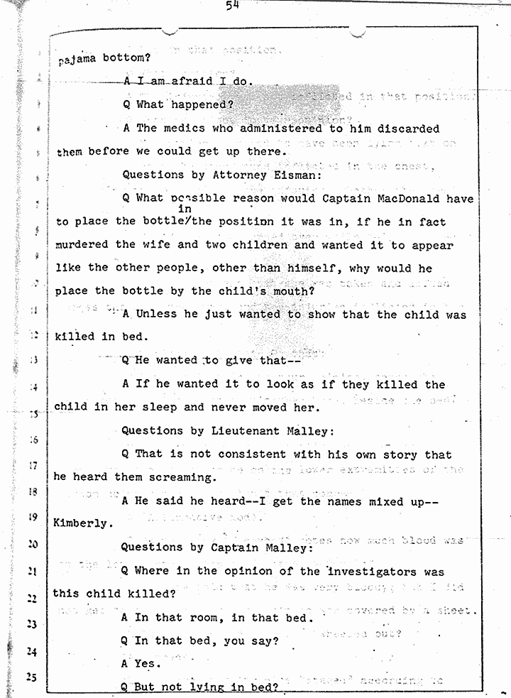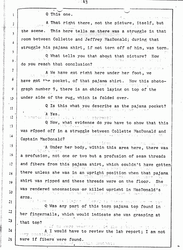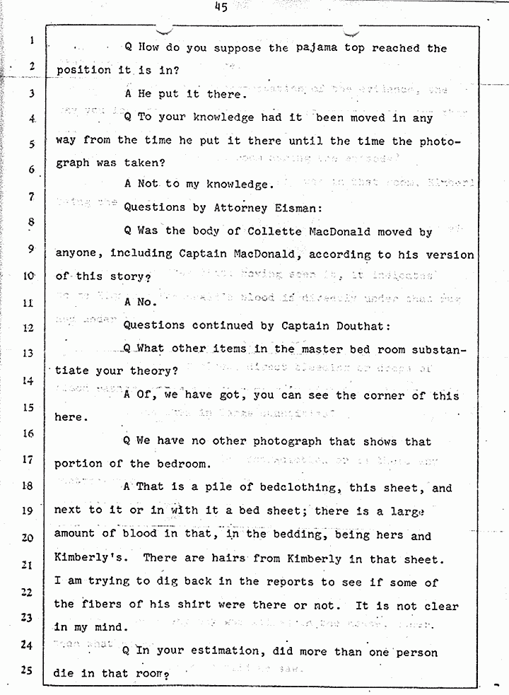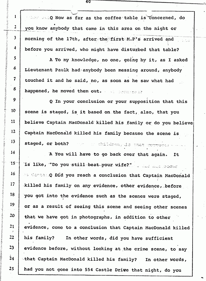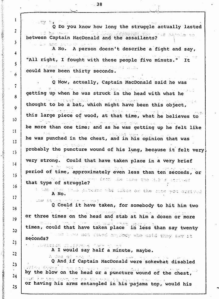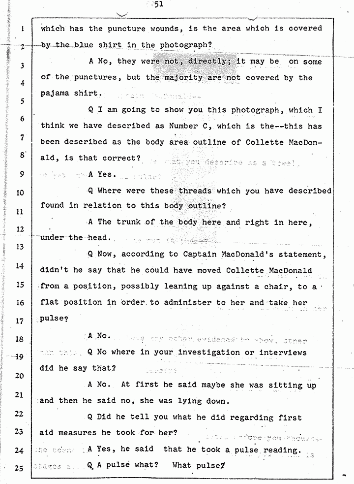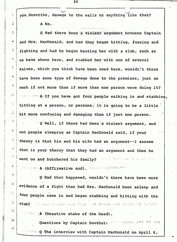 Q Is it consistent with your theory of Captain MacDonald have probably been in a hurry, after having committed these crimes and therefore wounding himself before he called the police, and afraid the neighbors may have heard, that he would take the time and effort to flush the toilet the number of times it would take to completely get rid of this evidence?