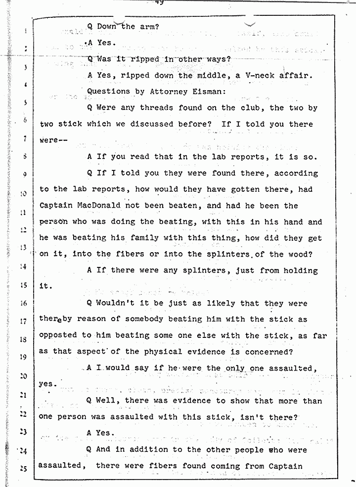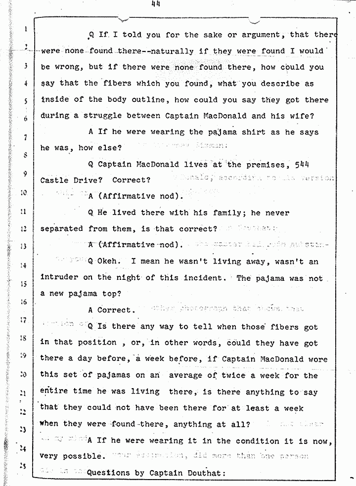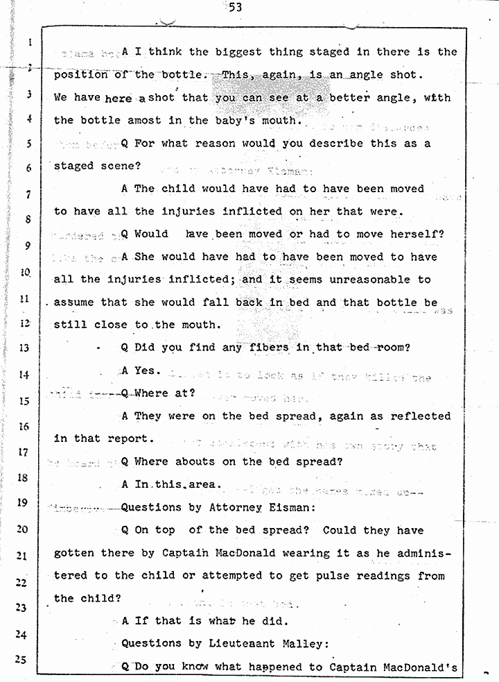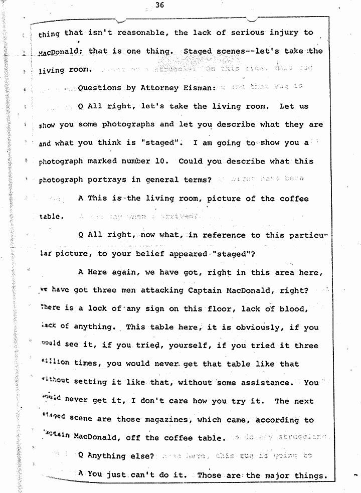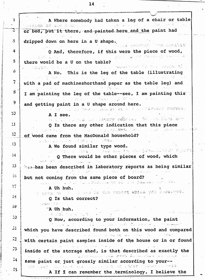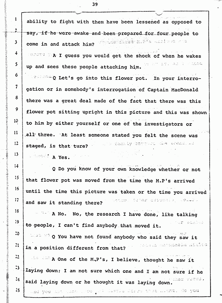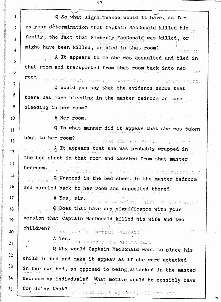 Q Is it consistent with your theory of Captain MacDonald have probably been in a hurry, after having committed these crimes and therefore wounding himself before he called the police, and afraid the neighbors may have heard, that he would take the time and effort to flush the toilet the number of times it would take to completely get rid of this evidence?