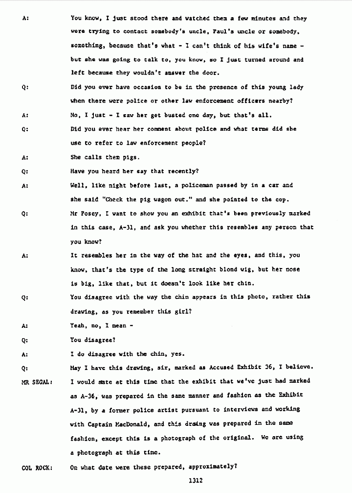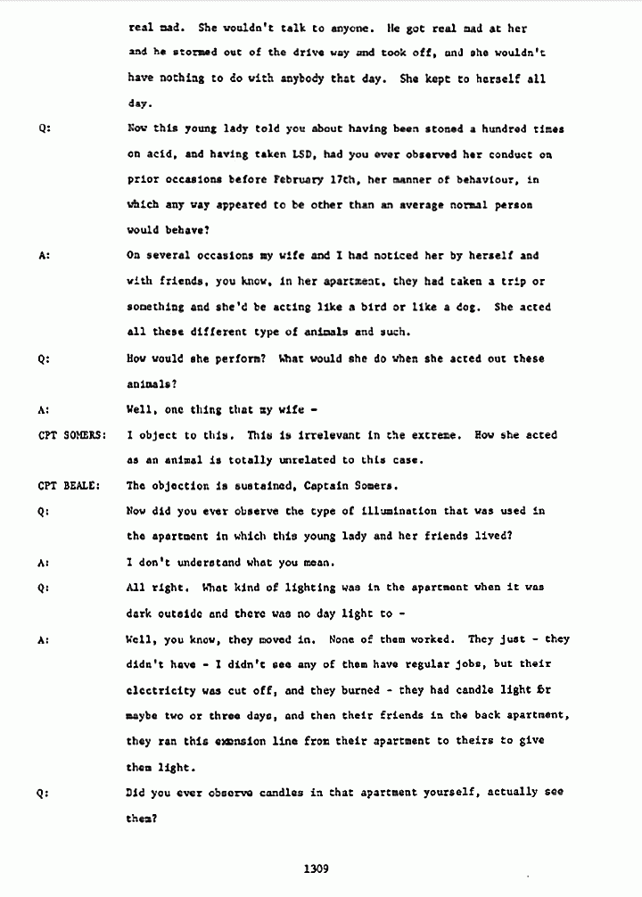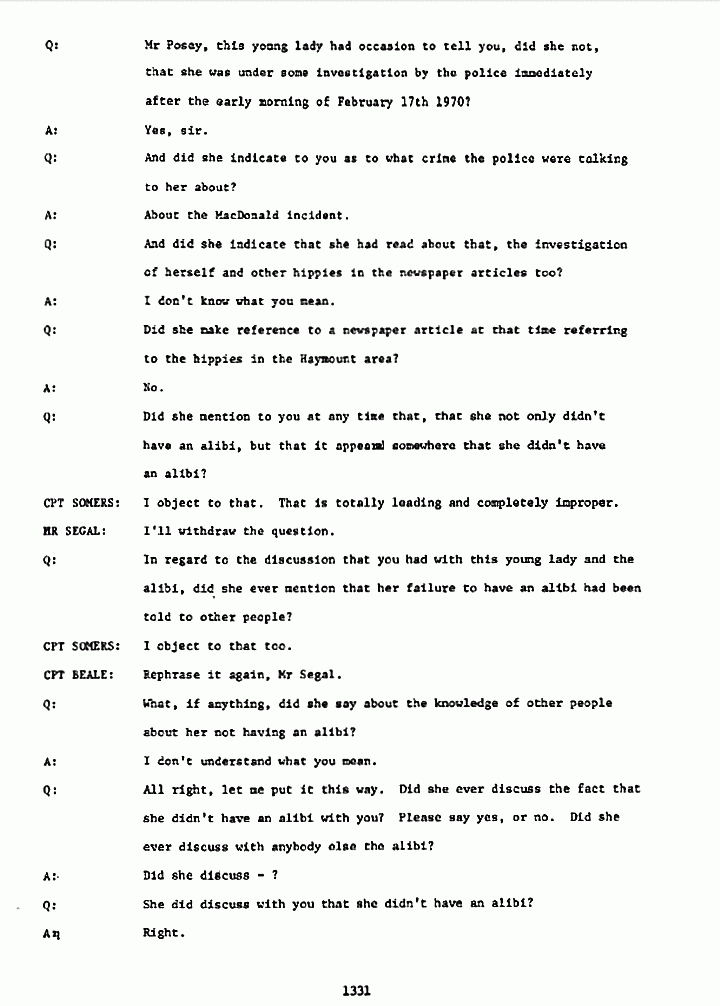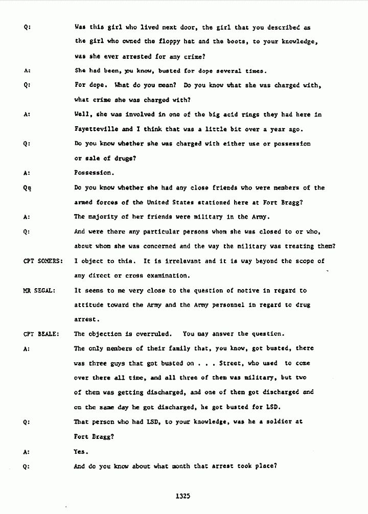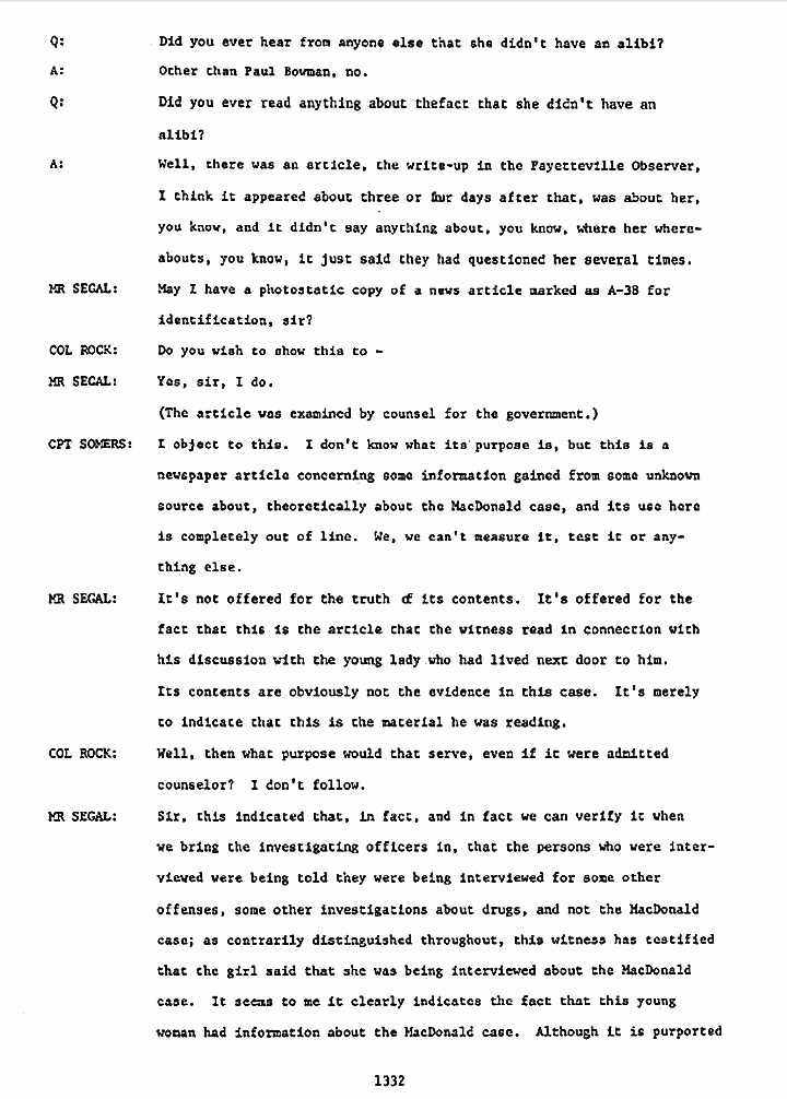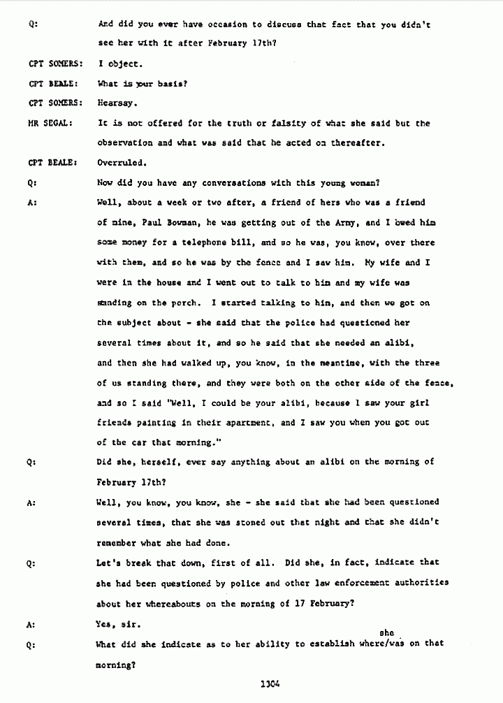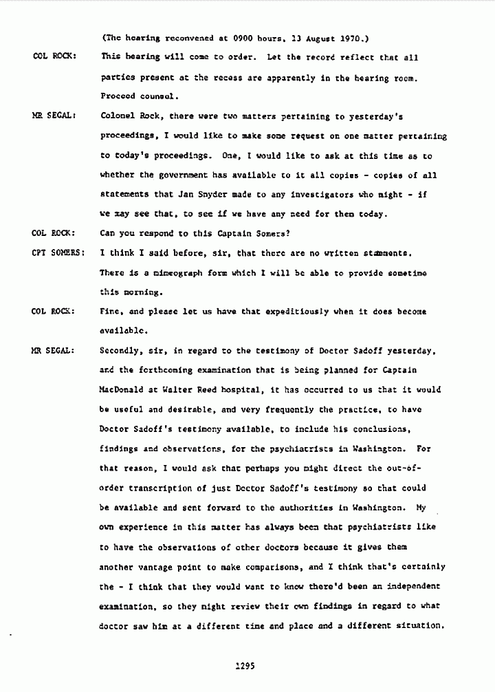MR. SEGAL: Secondly, sir, in regard to the testimony of Doctor Sadoff yesterday, and the forthcoming examination that is being planned for Captain MacDonald at Walter Reed Hospital, it has occurred to us that it would be useful and desirable and very frequently the practice, to have Doctor Sadoff's testimony available, to include his conclusions, findings and observations, for the psychiatrists in Washington. For that reason, I would ask that perhaps you might direct the out-of-order transcription of just Doctor Sadoff's testimony so that could be available and sent forward to the authorities in Washington. My own experience in this matter has always been that psychiatrists like to have the observations of other doctors, because it gives them another vantage point to make comparisons, and I think that's certainly the -- I think that they would want to know there'd been an independent examination, so they might review their own findings in regard to what doctor saw him at a different time and place and a different situation.