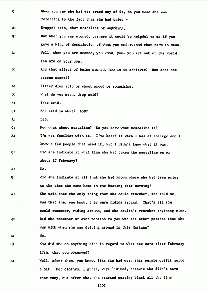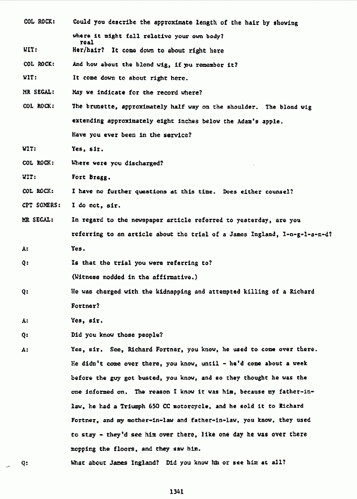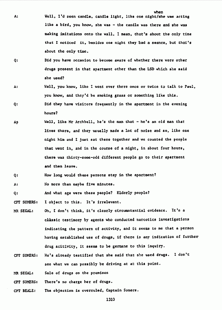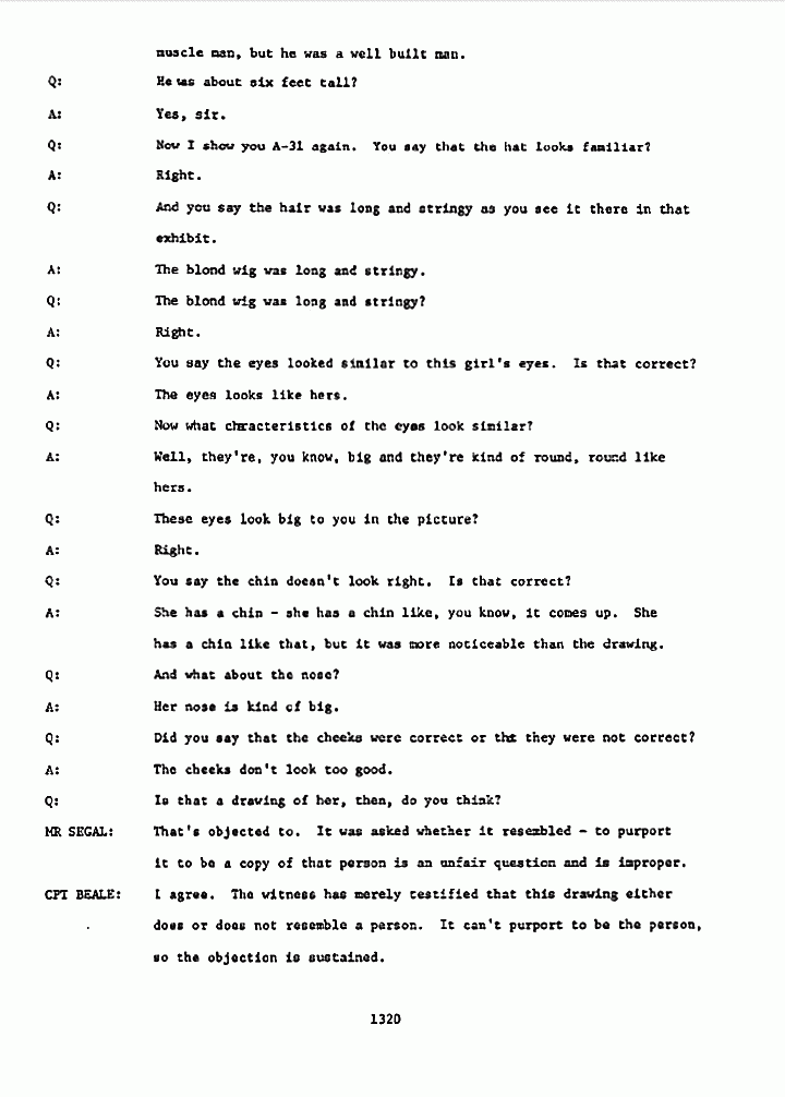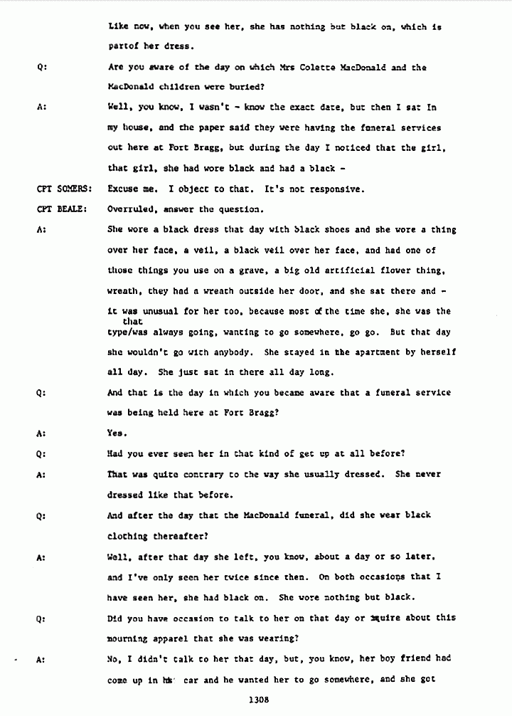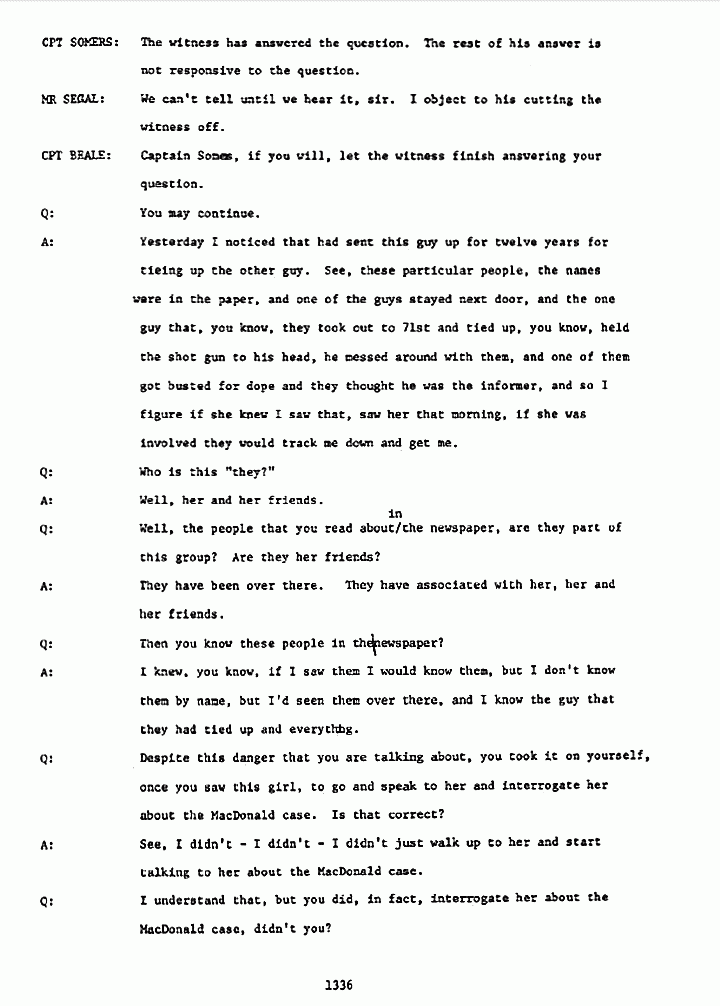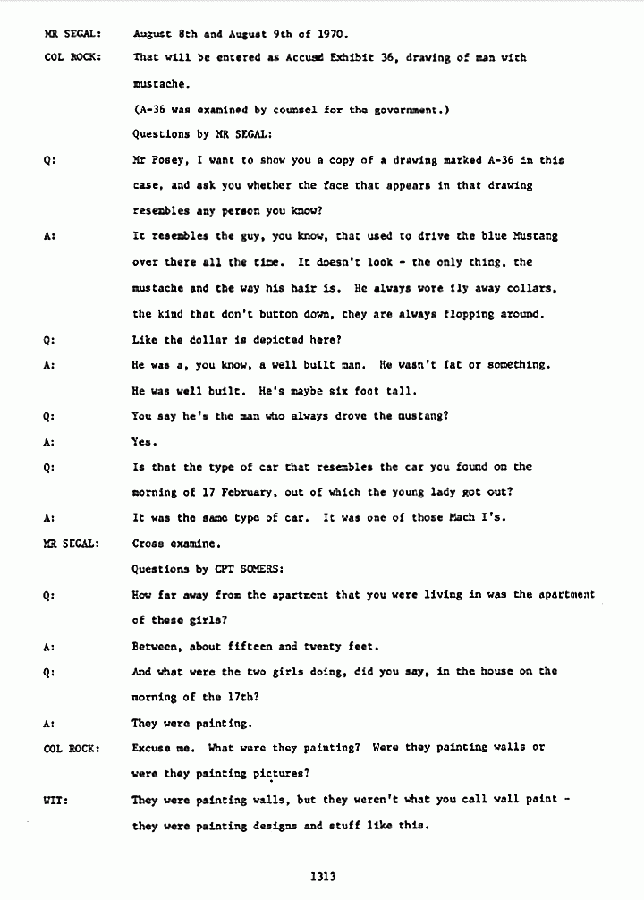 MR. SEGAL: Secondly, sir, in regard to the testimony of Doctor Sadoff yesterday, and the forthcoming examination that is being planned for Captain MacDonald at Walter Reed Hospital, it has occurred to us that it would be useful and desirable and very frequently the practice, to have Doctor Sadoff's testimony available, to include his conclusions, findings and observations, for the psychiatrists in Washington. For that reason, I would ask that perhaps you might direct the out-of-order transcription of just Doctor Sadoff's testimony so that could be available and sent forward to the authorities in Washington. My own experience in this matter has always been that psychiatrists like to have the observations of other doctors, because it gives them another vantage point to make comparisons, and I think that's certainly the -- I think that they would want to know there'd been an independent examination, so they might review their own findings in regard to what doctor saw him at a different time and place and a different situation.