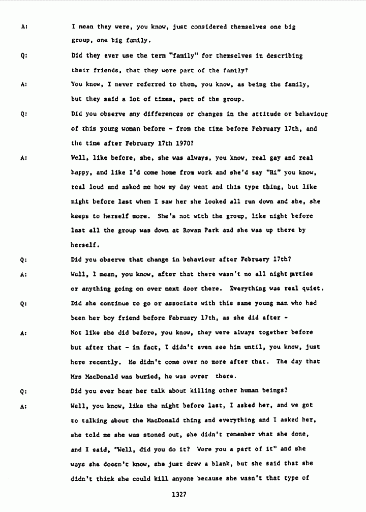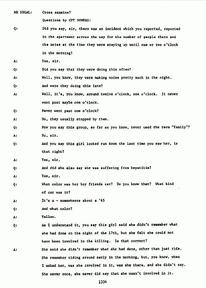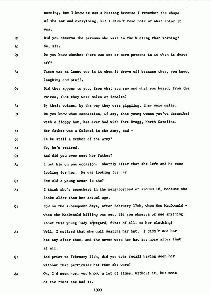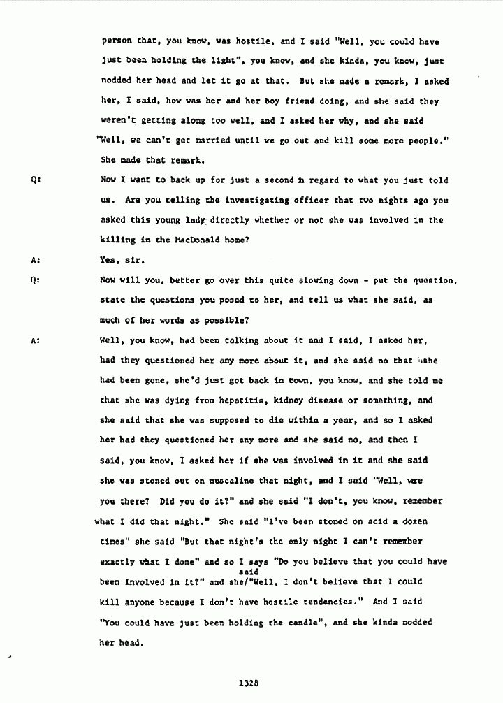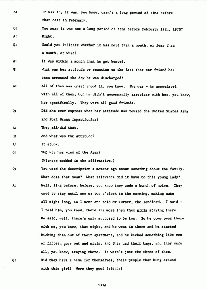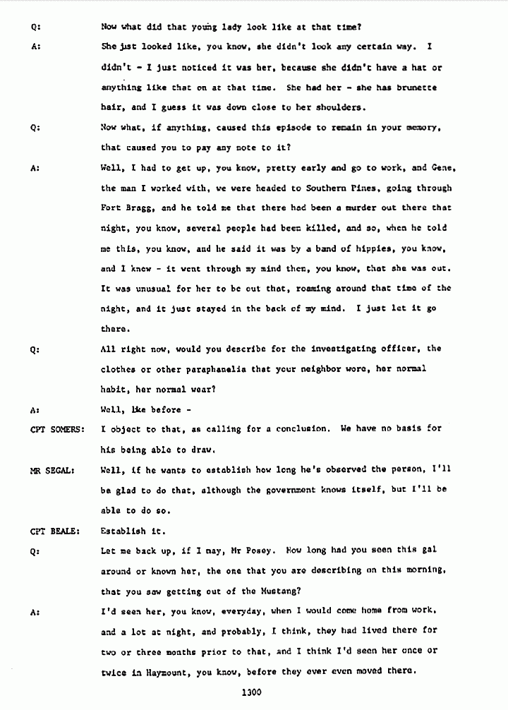 A Well, I had to get up, you know, pretty early to go to work and Gene, the man I work with, we were headed to Southern Pines, going through Fort Bragg, and he told me that there had been a murder out there that night, you know, several people had been killed, and so, when he told me this, you know, and he said it was by a band of hippies, you know, and I knew -- it went through my mind then, you know, that she was out. It was unusual for her to be out that, roaming around that time of the night, and it just stayed in the back of my mind. I just let it go there.