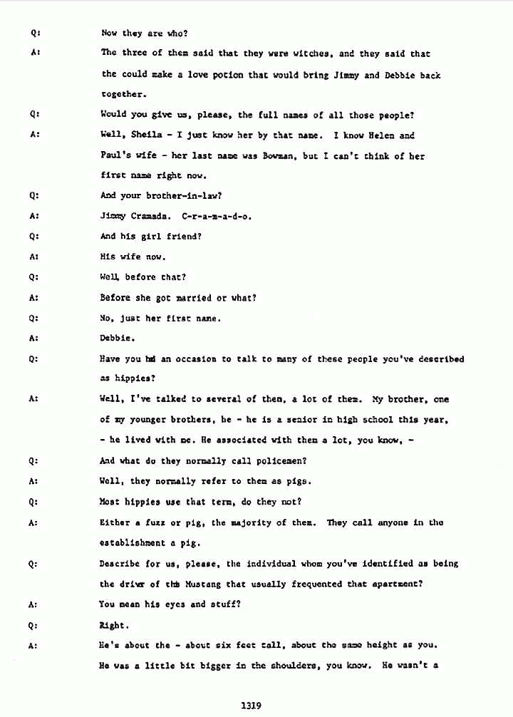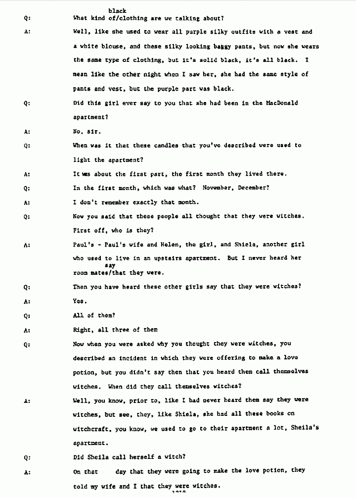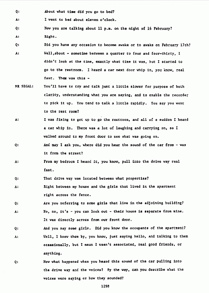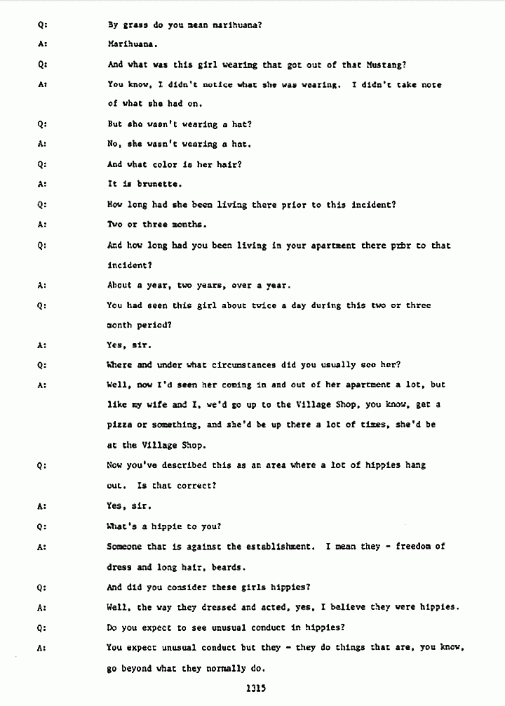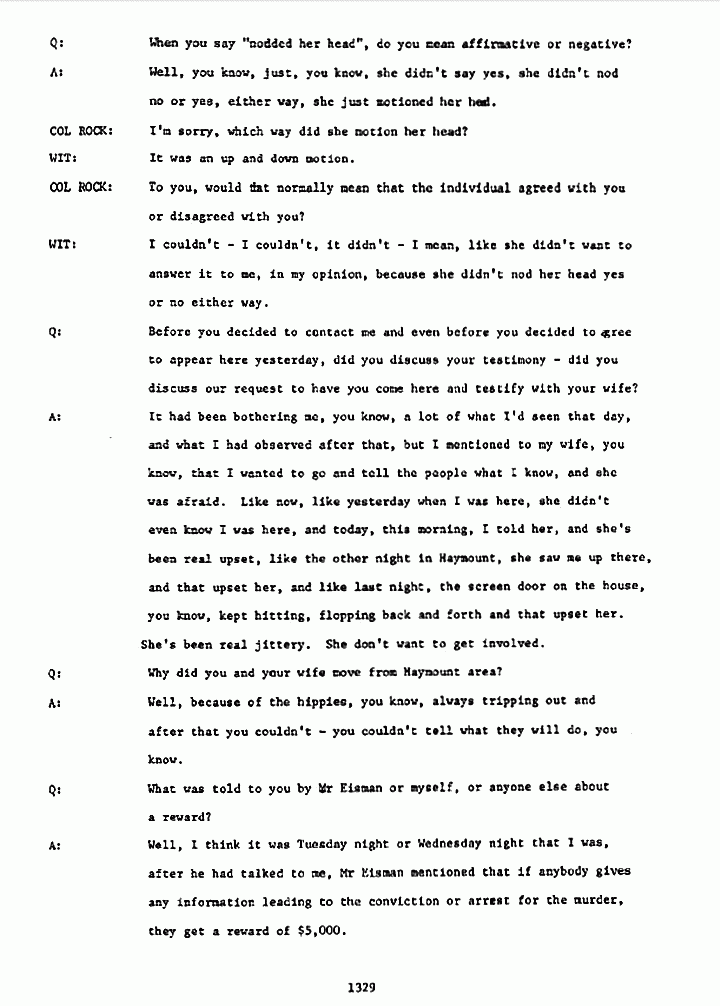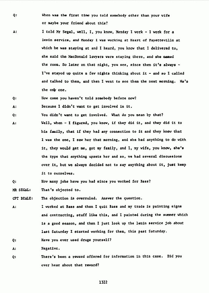 A Well, I had to get up, you know, pretty early to go to work and Gene, the man I work with, we were headed to Southern Pines, going through Fort Bragg, and he told me that there had been a murder out there that night, you know, several people had been killed, and so, when he told me this, you know, and he said it was by a band of hippies, you know, and I knew -- it went through my mind then, you know, that she was out. It was unusual for her to be out that, roaming around that time of the night, and it just stayed in the back of my mind. I just let it go there.