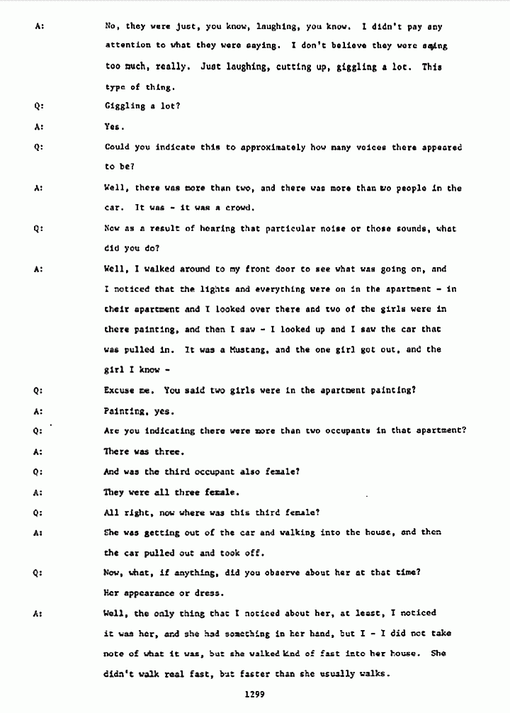 A Well, I walked around to my front door to see what was going on, and I noticed that the lights were on in the apartment -- in their apartment and I looked over there and two of the girls were in there painting, and then I saw -- I looked up and I saw the car that was pulled in. It was a Mustang, and the one girl got out, and the girl I know --
