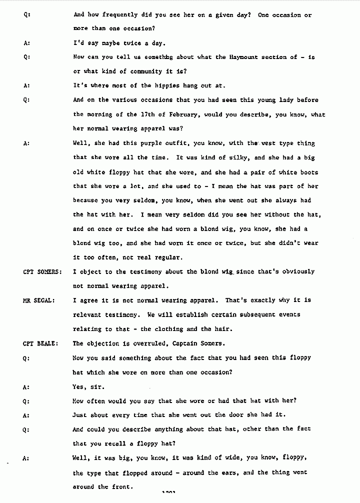 CPT SOMERS: I object to the testimony about the blonde wig, since that's obviously not wearing apparel.