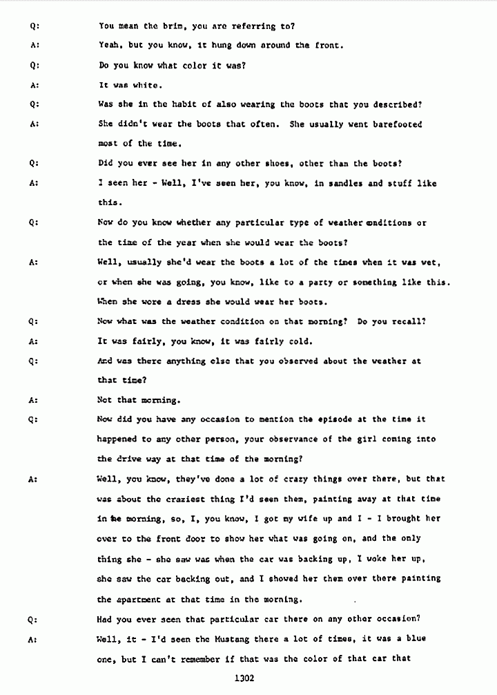 A Well, she had this purple outfit, you know, with the vest-type thing that she wore all the time. It was kind of silky, and she had a big old white floppy hat that she wore, and she had a pair of white boots that she wore a lot, and she use to -- I mean the hat was part of her because you very seldom, you know, when she went out she always had the hat with her. I mean very seldom did you see her without the hat, and on once or twice she had worn a blonde wig, you know, she had a blonde wig too, and she had worn it once or twice, but she didn't wear it too often, not real regular.