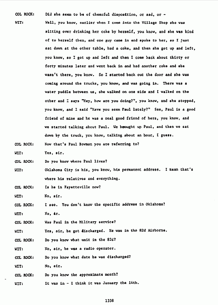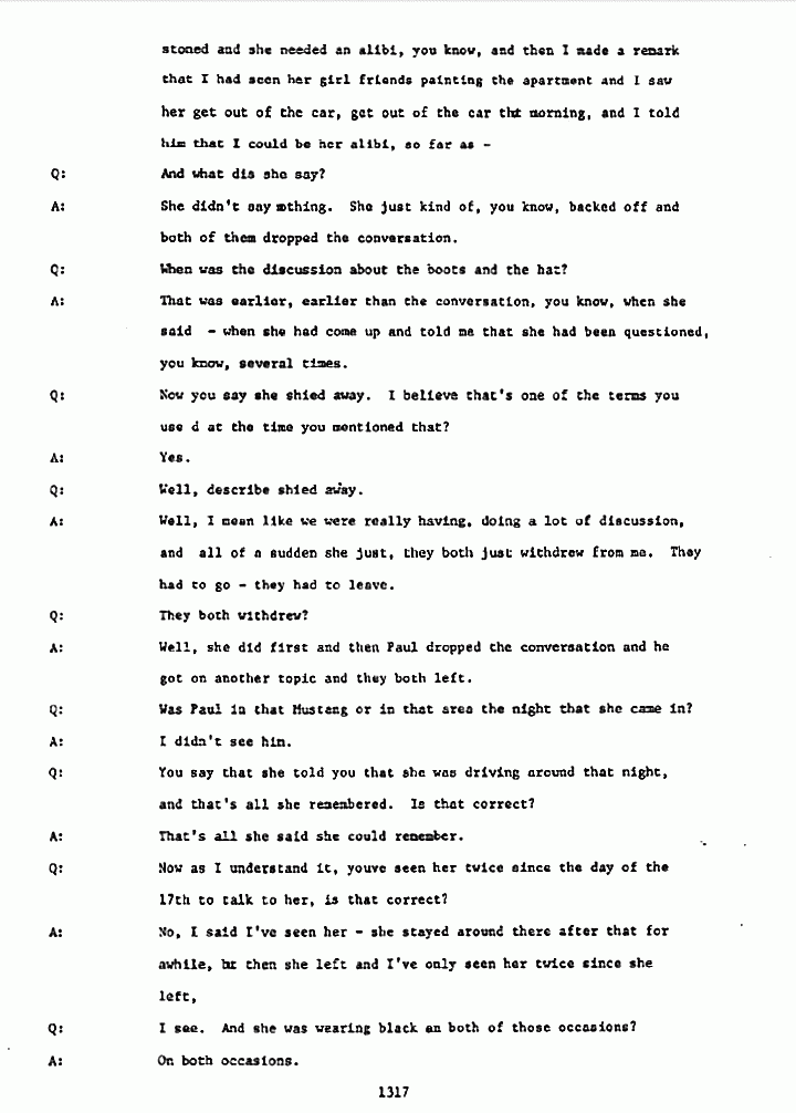 WITNESS: Well, you know, earlier when I come into the Village Shoppe she was sitting over drinking her Coke by herself, you know, and she was kind of to herself then, and one guy came and spoke to her, so I just sat down at the other table, had a Coke, and then she got up and left, you know, so I got up and left and then I come back thirty or forty minutes later and went back in and had another Coke and she wasn't there, you know. So I started back out the door and she was coming around the trucks, you know, and was going in. There was a water puddle between us, she walked on one side and I walked on the other and I says, "Hey, how are you doing?" you know, and she stopped, you know, and I said, "Have you seen Paul lately?" See, Paul is a good friend of mine and he was a real good friend of hers, you know, and we started talking about Paul, and then we sat down by the truck, you know, talking about an hour, I guess.