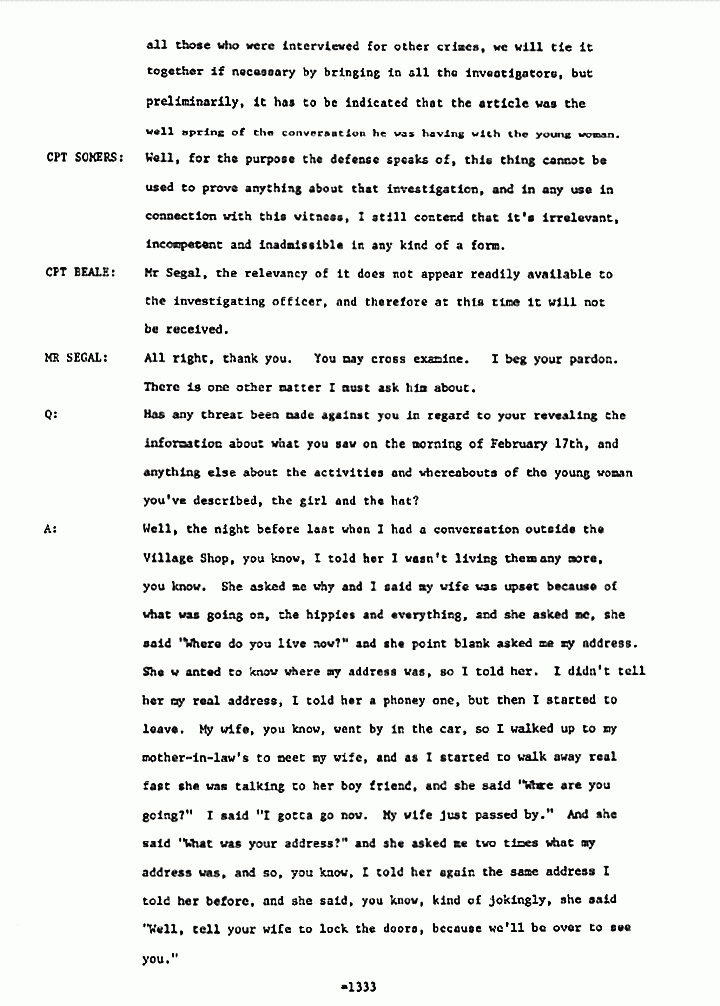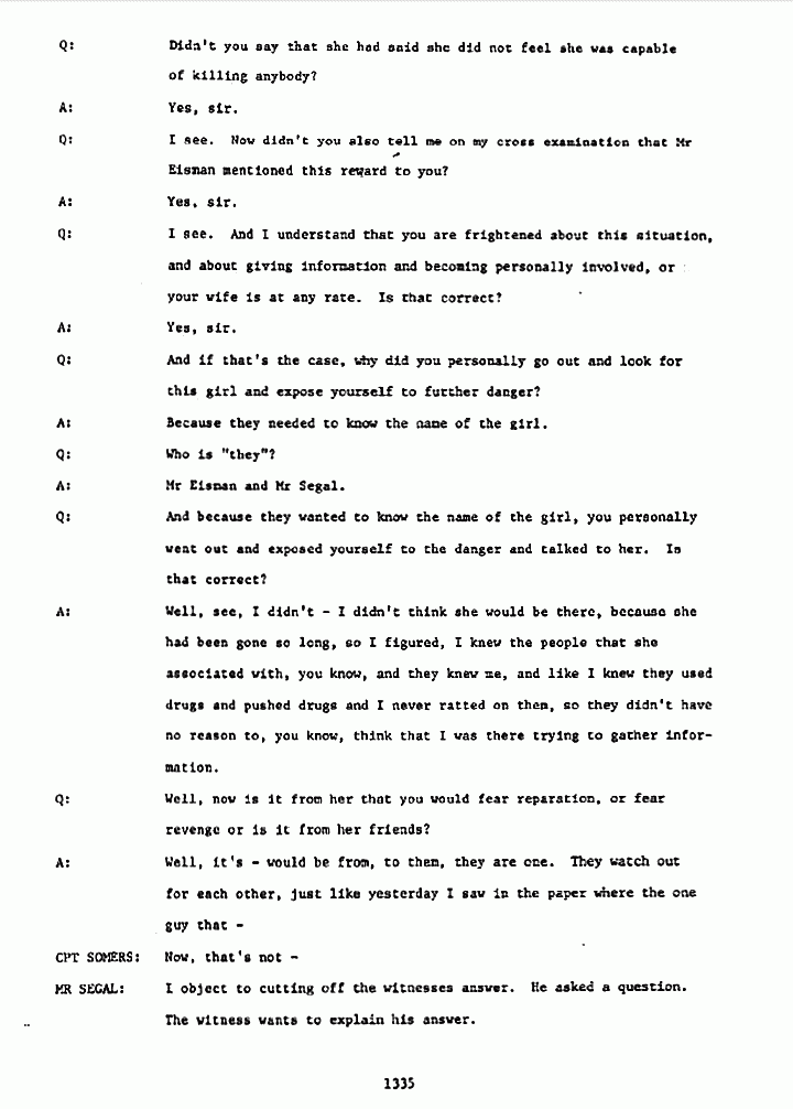 MR. SEGAL: Sir, at this time we are ready to proceed and call the next witness. In regard to this witness, he is a civilian person who has agreed to testify, even though we have no power to compel him to be here. He has repeatedly expressed to us great concern that he not have his name bandied about, released in any way, or spread out to the public. We have assured him on our part, in behalf of those civilian counsel and the accused and the military counsel, that we will absolutely honor that request. His wife is quite anxious that he not come here because her fear is that it might produce some repercussions, and there are even indications of the fact that repercussions have taken place, because it was known or suspected he might be coming here. I would ask also, sir, that you direct, although I am sure it will be a policy anyway, that all parties here honor the witness's request not to in any way cause his name to be released to any person except in the sense the investigators have to be directed to do anything, that they be likewise told not to needlessly in any way expose this person to the knowledge of civilians or other persons who do not absolutely have a need to know his name or anything about him.