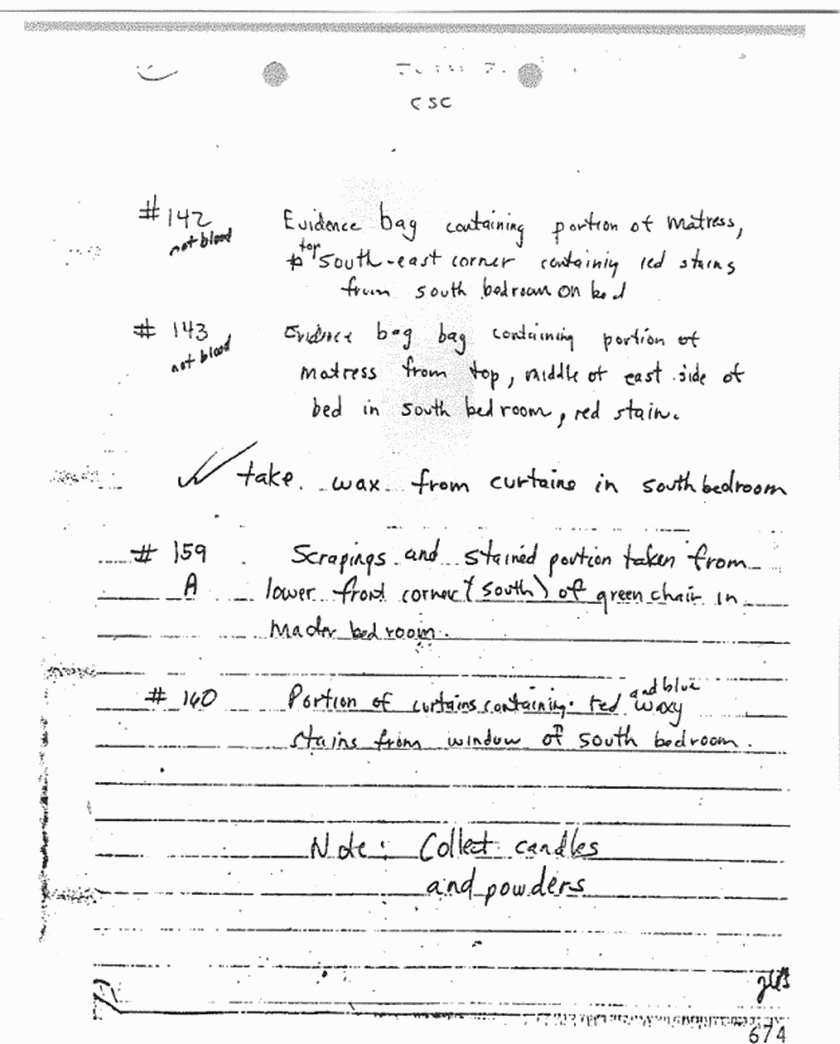 Hall floor, living room, dining room floors, white paint from sidewalk at rear of quarters, "Norforms" box, and wax from coffee table
