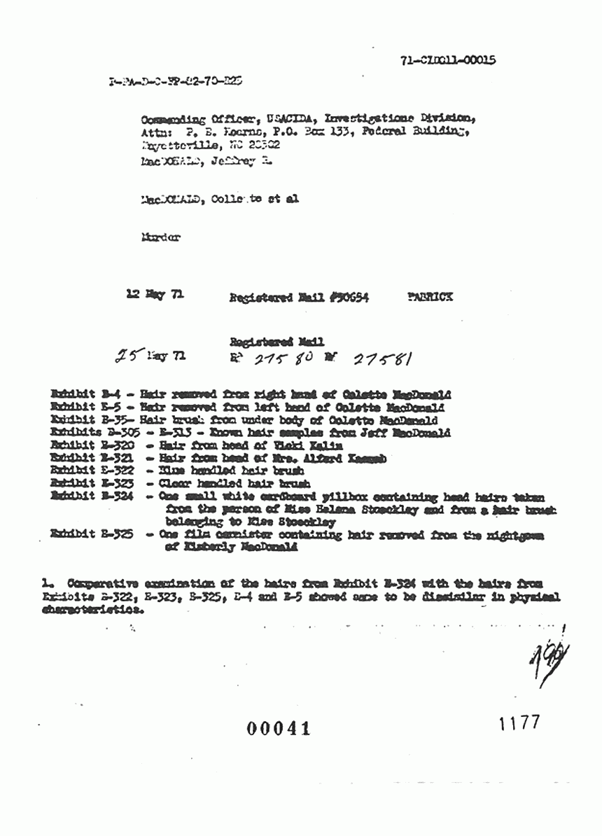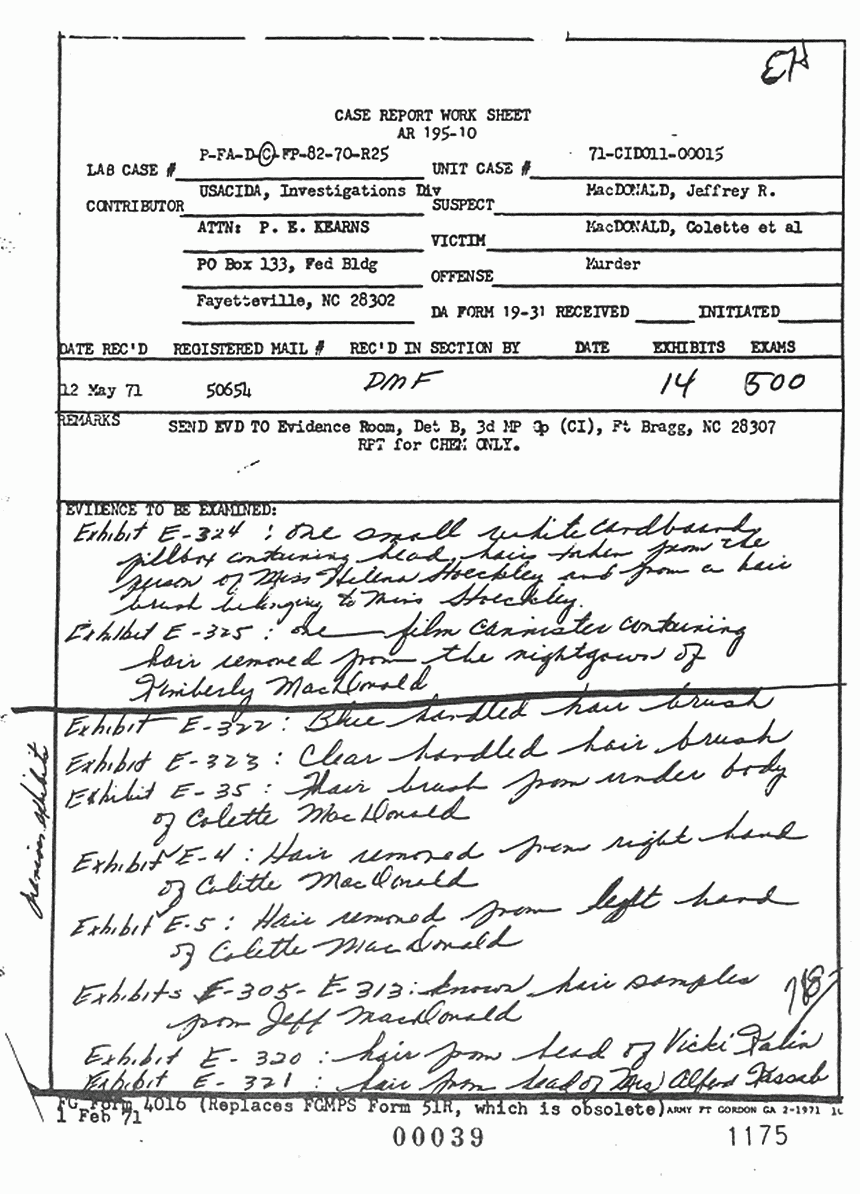May 6-25, 1971: Notes, worksheets and lab reports re: CID chemist Janice Glisson's examinations of hair samples, p. 1 of 10