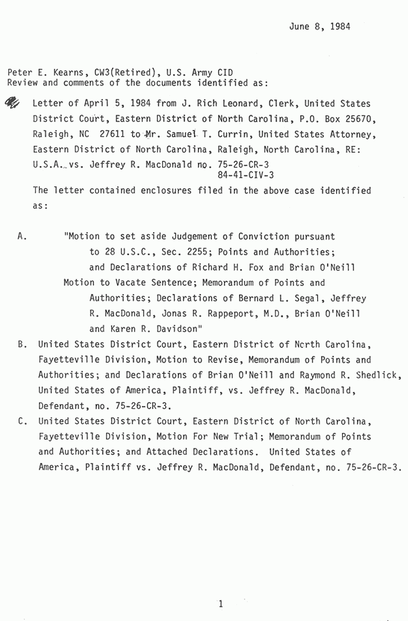 June 8, 1984: Review and comments by Peter Kearns to Brian Murtagh re: case documents, cover note