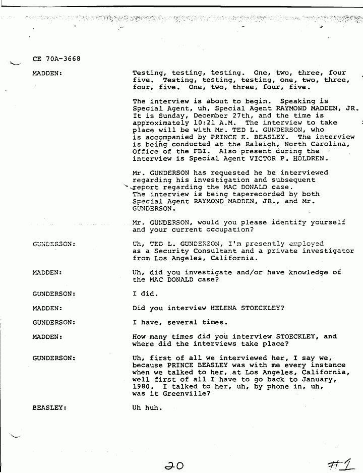 Mr. GUNDERSON has requested he be interviewed regarding his investigation and subsequent report regarding the MACDONALD case. The interview is being tape recorded by both Special Agent RAYMOND MADDEN, JR., and Mr. GUNDERSON.