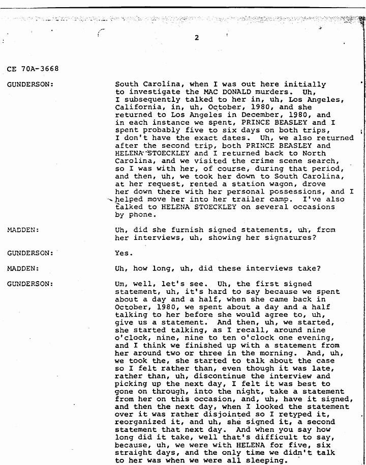 GUNDERSON: South Carolina, when I was out here initially to investigate the MACDONALD murders. Uh, I subsequently talked to her in, uh, Los Angeles, California, in, uh, October, 1980, and she returned to Los Angeles in December, 1980, and in each instance we spent, PRINCE BEASLEY and I spent probably five to six days on both trips, I don't have the exact dates. Uh, we also returned after the second trip, both PRINCE BEASLEY and HELENA STOECKLEY and I returned back to North Carolina, and we visited the crime scene search, so I was with her, of course, during that period, and then, uh, we took her down to South Carolina, at her request, rented a station wagon, drove her down there with her personal possessions, and I helped move her into her trailer camp. I've also talked to HELENA STOECKLEY on several occasions by phone.