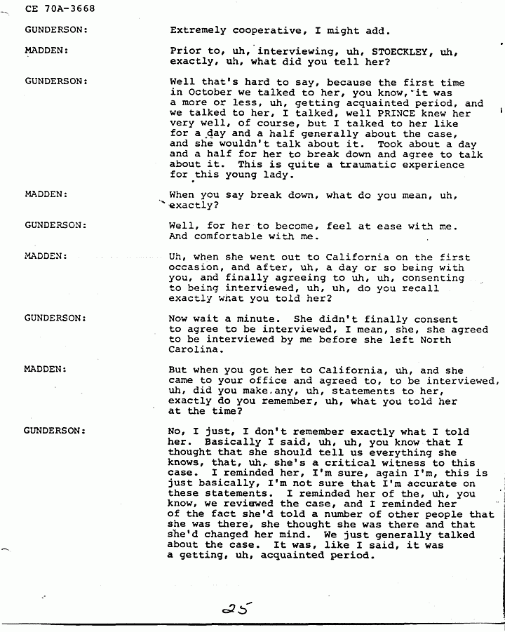 GUNDERSON: Well that's hard to say, because the first time in October we talked to her, you know, it was a more or less, uh, getting acquainted period, and we talked to her, I talked, well PRINCE knew her very well, of course, but I talked to her like for a day and a half generally about the case, and she wouldn't talk about it. Took about a day and a half for her to break down and agree to talk about it. This is quite a traumatic experience for this young lady.