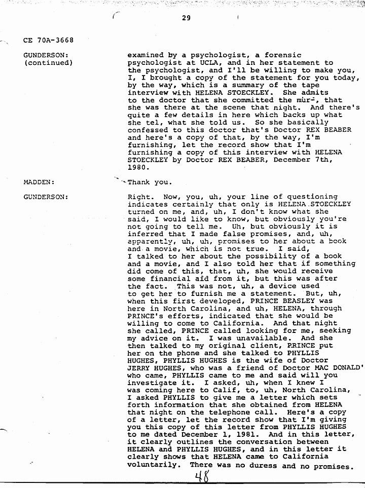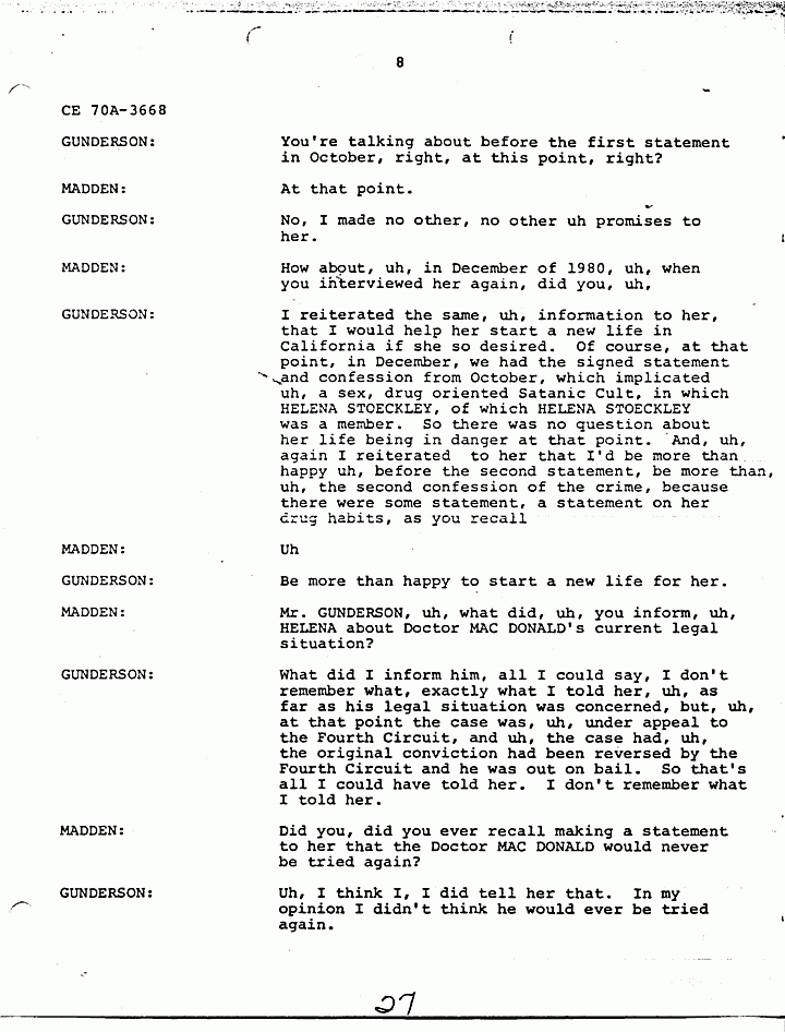 GUNDERSON: I reiterated the same, uh, information to her, that I would help her start a new life in California if she so desired. Of course, at that point, in December, we had the signed statement and confession from October, which implicated uh, a sex, drug oriented Satanic Cult, in which HELENA STOECKLEY, of which HELENA STOECKLEY was a member. So there was no question about her life being in danger at that point. And, uh, again I reiterated to her that I'd be more than happy uh, before the second statement, be more than, uh, the second confession of the crime, because there were some statement, a statement on her drug habits, as you recall