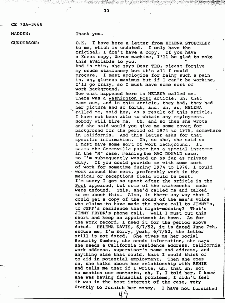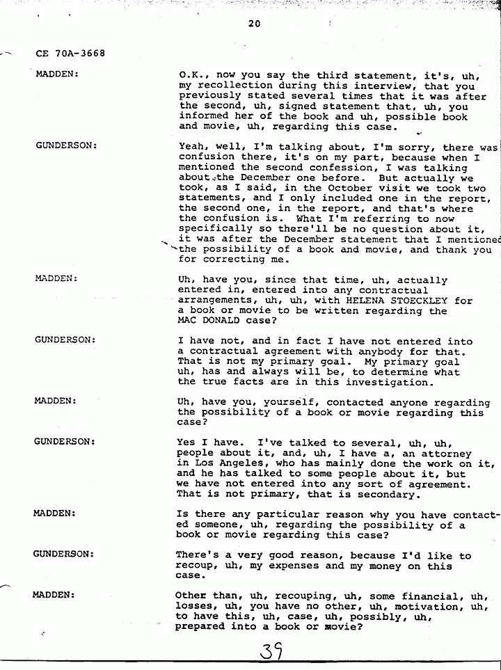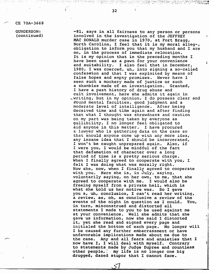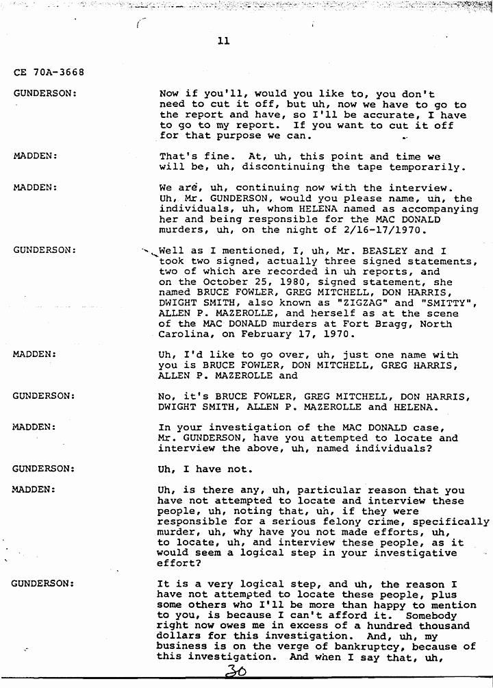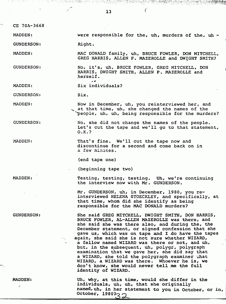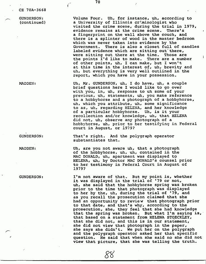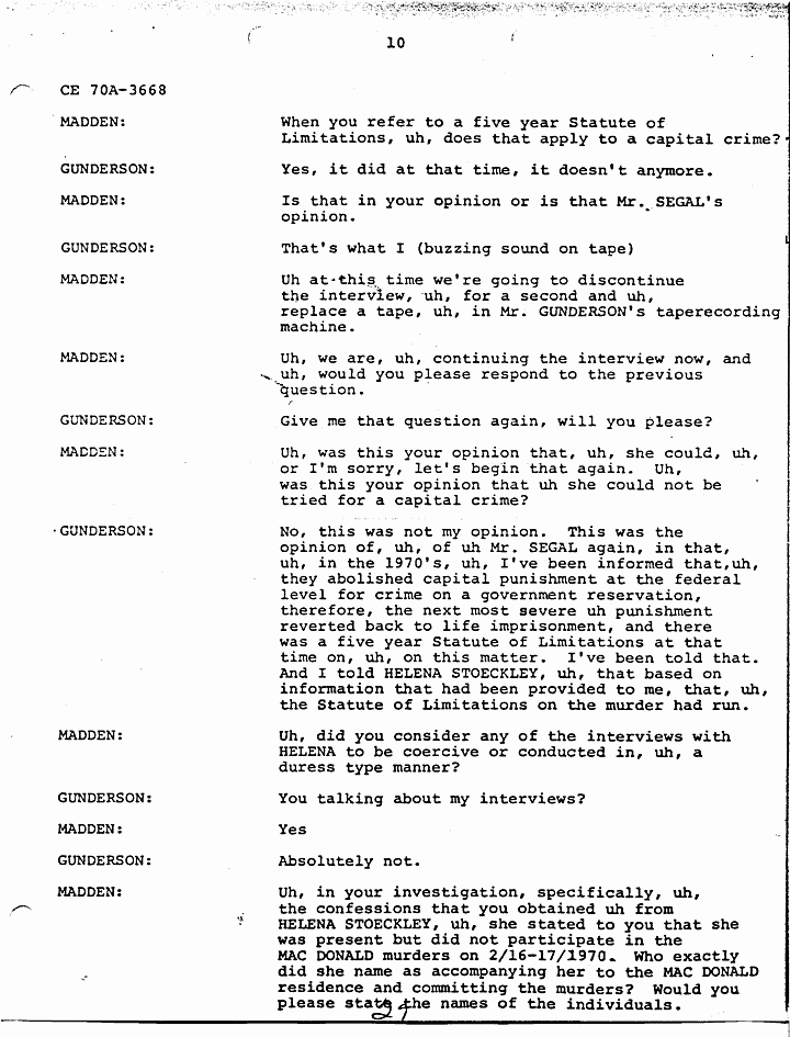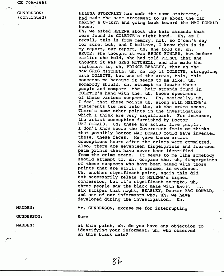 GUNDERSON: O.K., uh, basically there is information in HELENA STOECKLEY's signed confession that I feel is very significant and that has been corroborated through independent investigation, and I don't need to go into a lot of detail, because as I said they're all in the report. But JIMMY FRYERS's telephone call to the house that night in which HELENA admitted in her statement that she answered the phone, JIMMY's prior statement and HELENA's statement are almost identical as to what transpired during the conversation. The hobbyhorse which has been discussed and rediscussed by all, in all areas and by many people involved in the investigation, and also by defense and prosecution, uh, in that when HELENA gave us a confession she said that she tried to ride the hobbyhorse, she couldn't the spring was broken. Uh, we took her to a polygraph operator and one of the questions he asked her was did you see, and of course the prosecution claims she saw the photograph in the newspaper, that's why that is not a significant point, but the polygraph operator asked her did you see the photograph in the Fayetteville paper, uh, that uh, showed the hobbyhorse. And she said in the polygraph examination she did not see it and the polygraph examiner says that based on his analysis she was telling the truth when she said she did not see it. Now if you've ever seen this photograph, and looked at it, you can tell, you cannot tell, I emphasize you cannot tell the spring is broken by looking at the photograph. Uh another very significant point that, uh, places HELENA at the crime scene that has never come out, but was developed during our investigation, was the German Shepherd dog that was tied to the clothesline. The dog belonged to JANICE PENDLYSHOK. She pointed to the precise location where the dog was tied to a clothesline. JANICE PENDLYSHOK kept the dog there at night on a regular basis. Another point I'd like to make is that during the confession, HELENA, we asked HELENA specifically if there was anything that she could remember, anything about the furniture or anything in the house that would place her there. She said the jewelry box. She identified the jewelry box as being on the low dresser in the master bedroom, pushed toward the back of the dresser, approximately a foot and a half from the left, uh, and we uh, obtained a catalog, I forget if it was a Sears Catalog, or what, she picked out the two jewelry boxes which the MACDONALD jewelry box most closely resembled, and they are very similar. The prosecution has made the statement that HELENA STOECKLEY had seen the crime scene photographs, which is true. She was shown the crime scene photographs in the presence of, uh, some of the, uh, people involved in defense of Doctor MACDONALD during the 1979 trial. She was eating a sandwich and she did not look at them in detail. She merely flipped the pages. So I don't honestly feel that from flipping the pages she would have necessarily noticed the exact location and details of the jewelry box. In fact, when you look at the crime scene pictures, it's almost, it's extremely difficult to locate the jewelry box on the dresser, but that's exactly where it's located. Another very significant point, again in HELENA STOECKLEY's signed confession, she pointed out that the getaway cars were parked at 310 Castle Drive. JAN SNYDER was at 308 Castle Drive. JAN SNYDER looked down, she described the car, the blue Mustang she, from looking at a, an artist conception of the four people who Doctor MACDONALD says were in the house that night, she described the person on the passenger side as ALLEN P. MAZEROLLE. She said the street light was, uh, shining into his face and that's why she identified him as, MAZEROLLE. JAN PEN, uh, SNYDER also said that when the car left that there were two cars and the military vehicle. When they left there, they ma, they headed up, instead of heading away from MACDONALD's house, they made a U-turn and headed toward MACDONALD's house. HELENA STOECKLEY has made the same statement, had made the same statement to us about the car making a U-turn and going back toward the MACDONALD house. Uh, we asked HELENA about the hair strands that were found in COLETTE's right hand. Uh, as I recall, this is from memory, not, so I can't say for sure, but, and I believe, I know this is in my report, our report, uh, she told us, uh, BRUCE, she thought it was BRUCE FOWLER, but before earlier she told, she had told PRINCE that she thought it was GREG MITCHELL, and she made the statement to, uh, PRINCE BEASLEY, that uh she saw GREG MITCHELL, uh, on top of COLETTE, struggling with COLETTE, but one of the areas, this, this concerns me because it seems to me like, uh, somebody should, uh, attempt to locate these people and compare the hair strands found in COLETTE's hand with the, uh, known specimens of these various suspects. Uh, basically, uh, I feel that these points uh, along with HELENA's statements tie her into the, at the crime scene. There's some other points in the investigation which I think are very significant. For instance, the artist conception furnished by Doctor MACDONALD. Uh, these are actual live people. I don't know where the Government feels or thinks that possibly Doctor MACDONALD could have invented these, these faces. He gave these artist conceptions hours after the crimes were committed. Also, there are seventeen fingerprints and fourteen palm prints that have never been identified from the crime scene. It seems to me like somebody should attempt to, uh, compare the, uh, fingerprints of these suspects who have been named with those prints that are still, I assume, in evidence. Uh, another significant point, again this did not necessarily relate to HELENA's signed confession, but it's significant to note, uh, three people saw the black male with E-6, six stripes that night, BEASLEY, Doctor MACDONALD, and one of our informants who, uh, we have developed during the investigation. Uh,