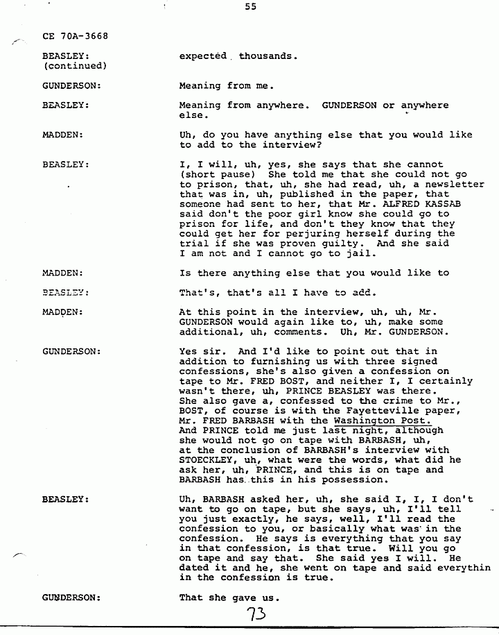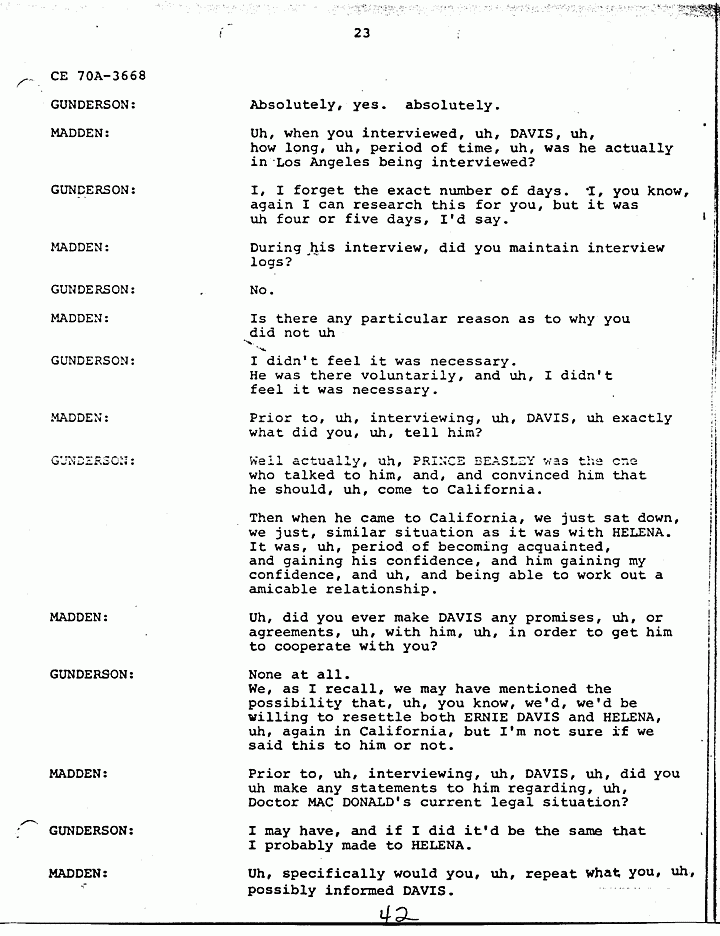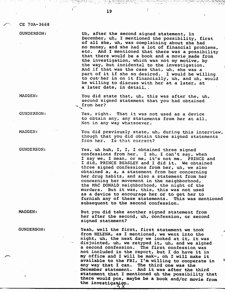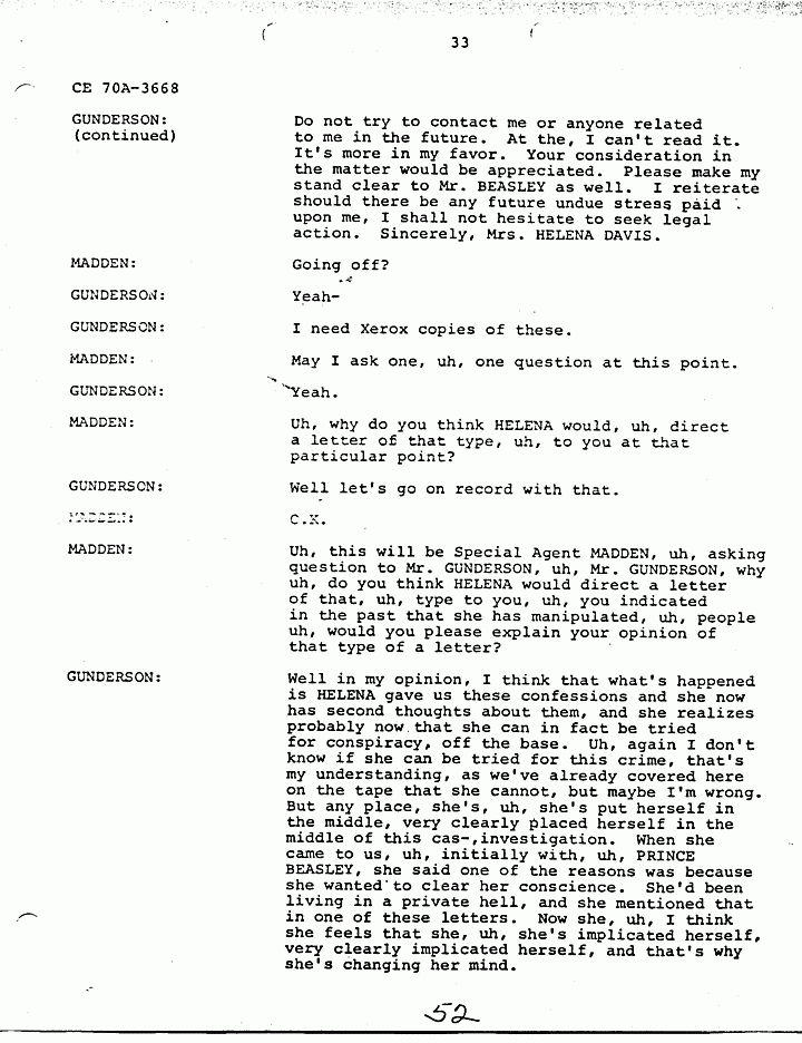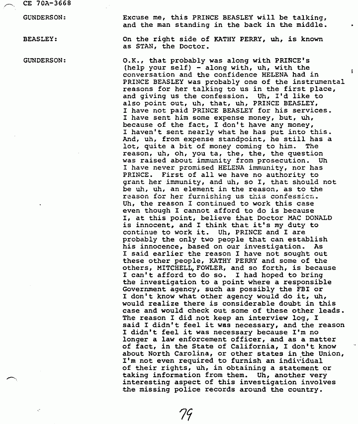 GUNDERSON: O.K., that probably was along with PRINCE's (help yourself) - along with, uh, with the conversation and the confidence HELENA had in PRINCE BEASLEY was probably one of the instrumental reasons for her talking to us in the first place, and giving us the confession. Uh, I'd like to also point out, uh, that, uh, PRINCE BEASLEY, I have not paid PRINCE BEASLEY for his services. I have sent him some expense money, but, uh, because of the fact, I don't have any money, I haven't sent nearly what he has put into this. And, uh, from expense standpoint, he still has a lot, quite a bit of money coming to him. The reason, uh, oh, you ta, the, the, the question was raised about immunity from prosecution. Uh I have never promised HELENA immunity, nor has PRINCE. First of all we have no authority to grant her immunity, and uh, so I, that should not be uh, uh, an element in the reason, as to the reason for her furnishing us this confession. Uh, the reason I continued to work this case even though I cannot afford to do is because I, at this point, believe that Doctor MACDONALD is innocent, and I think that it's my duty to continue to work it. Uh, PRINCE and I are probably the only two people that can establish his innocence, based on our investigation.