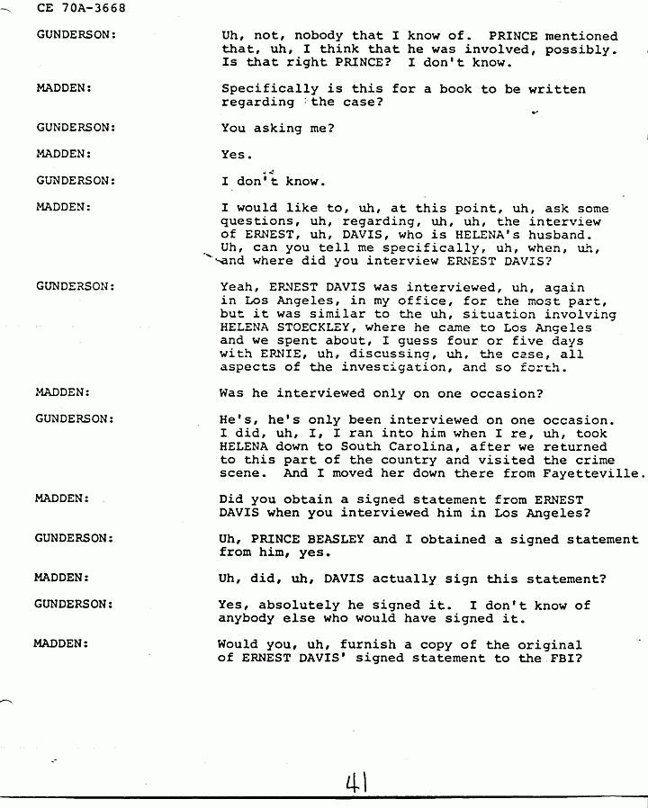 GUNDERSON: Uh, we have ERNIE DAVIS' statement, which I think is quite significant. And ERNIE DAVIS puts her at the crime scene. Uh, we also, uh, located a man who is presently in prison, who HELENA contacted after the murders at one of the parks in Fayetteville, and uh, she said that she was there, that she was involved in the murders, to this man, who is presently incarcerated in one of our penitentiaries.
