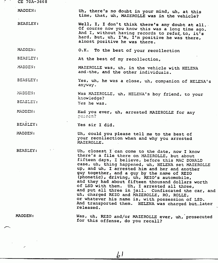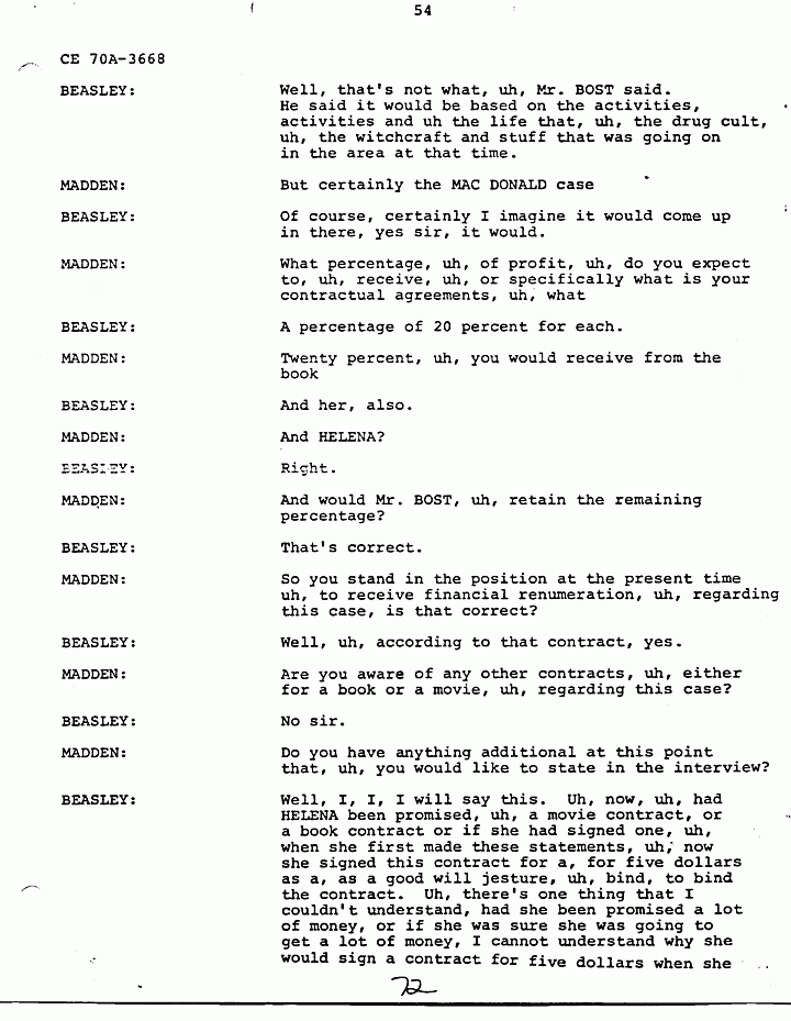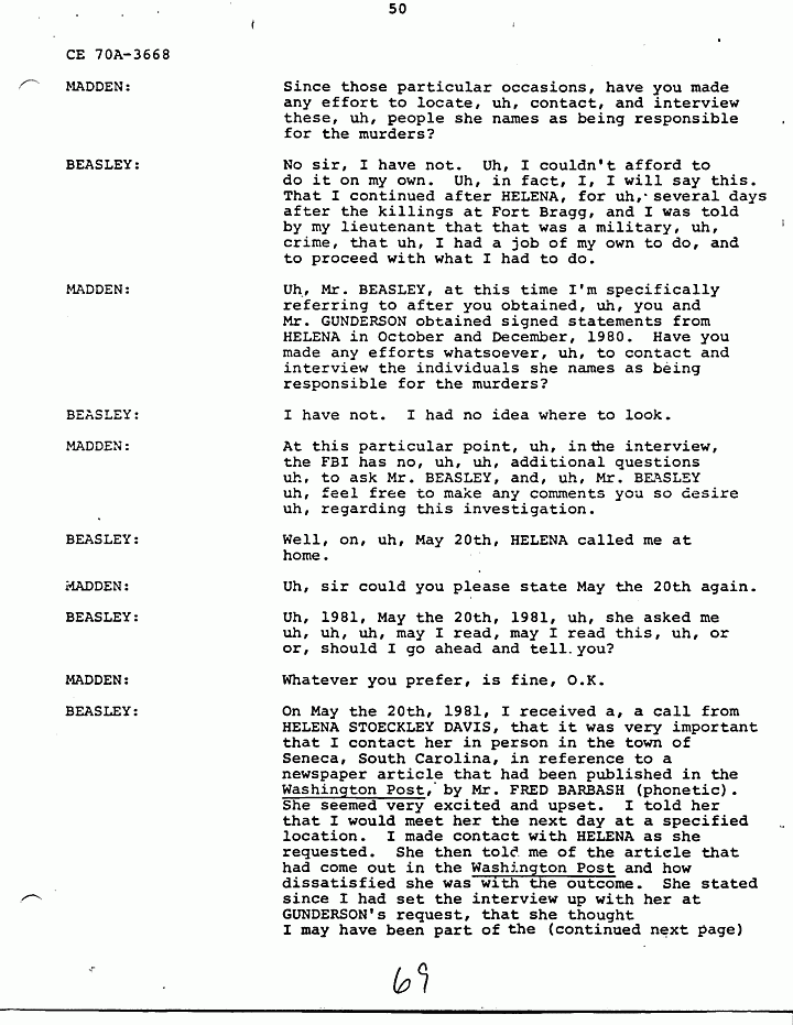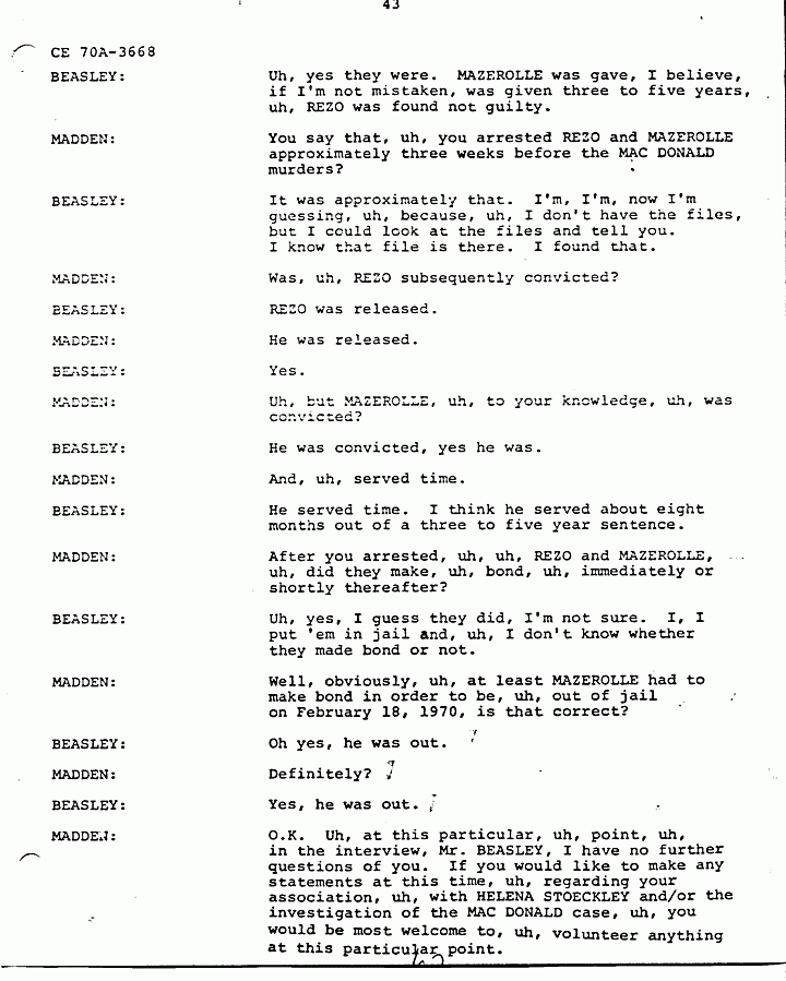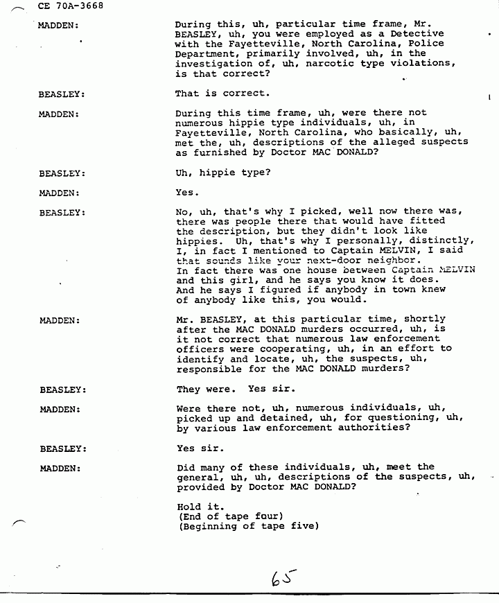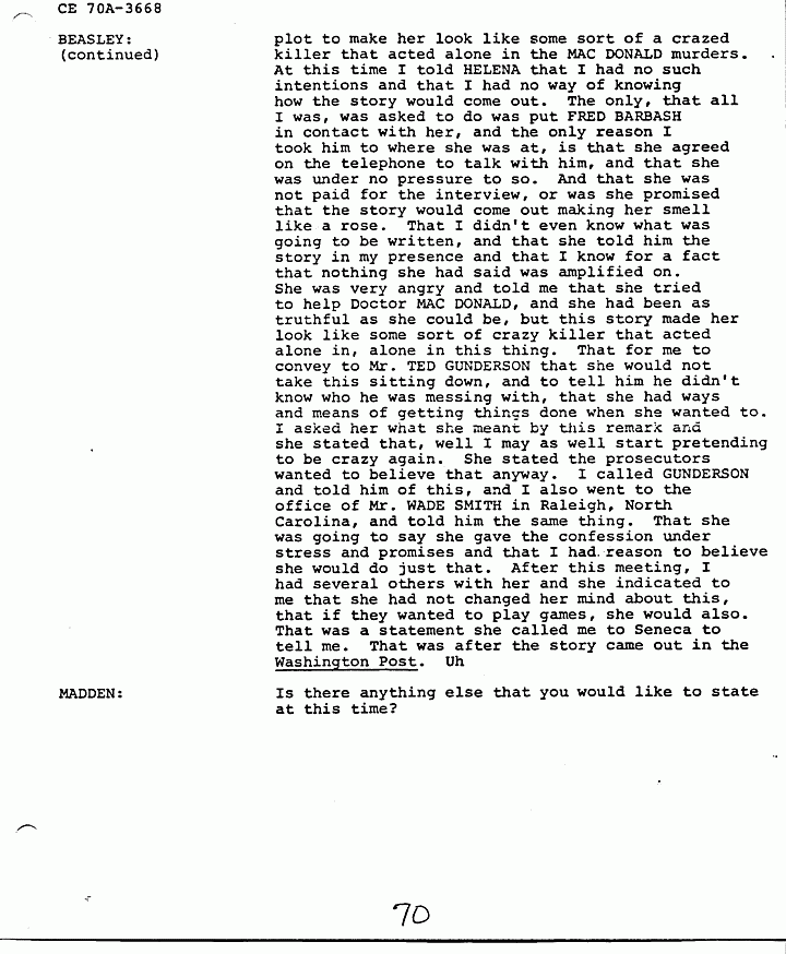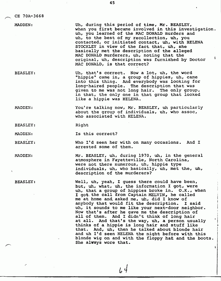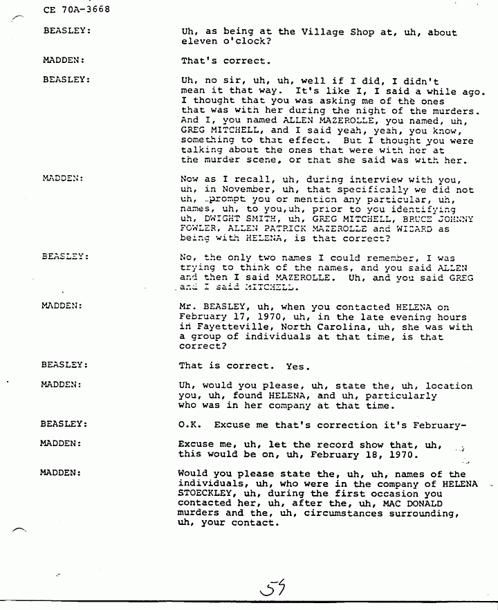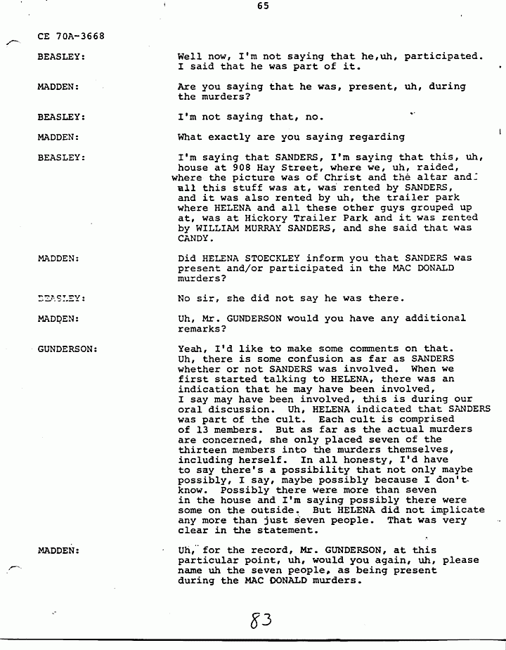 MADDEN: I would like for Mr. BEASLEY to answer that. Mr. BEASLEY are you now saying that, that Mr. SANDERS was also involved, uh, in the MACDONALD murders, in addition to the people, uh, you previously named as informed by HELENA?