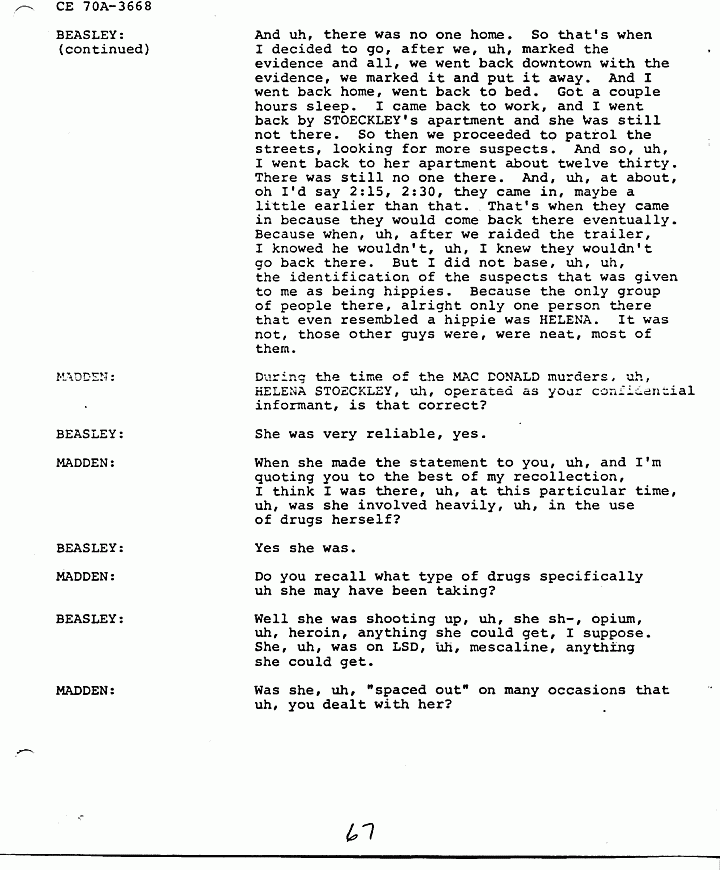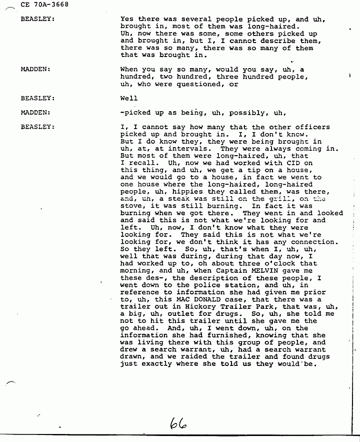 BEASLEY: Uh, prior, uh, three, two or three months prior to the killings of the MACDONALDs, HELENA told me that the Black Cult had moved into Fayetteville. Uh, that there was three houses there at that time. That they were spreading out and they were very dangerous, they would stop at nothing. They would, uh, uh, nothing would stand in, would stop them. And I asked her what she meant by it, she told me what, and then she explained to me about the black cats, and about uh sex orgy, orgies, orgies and things they did, and I tried to get her to get me into one of the houses. She says no I can't do that, because you'd never get out alive if I did. I said how about an informant, can I get one of them in there. She said no they'd spot him like that. So, uh, uh, she gave me information on one of the houses. I suspected as being uh what she called a cult house. We went into the house, uh, on a search warrant, uh, with information she furnished. We, uh, had to force the door, they wouldn't let us in. We had to kick the door down. We went in and the first thing I saw on the wall, uh, was, was a white wall. The first thing I saw was a picture of Jesus Christ, been drawn by, uh, was good artistry. And a hippie was down on his knees performing oral sex on him, on, on Jesus Christ. Our ID Bureau took pictures of this and, and uh, they had, they had altar in there, they had everything there that she said would, would be there, or all that was ordinarily in these cult houses. But we didn't find any drugs. And I later went back to HELENA and asked her why I didn't find any drugs. She said well that's the only one I've ever turned in and warned that you were coming. That was, guy was known as CANDY and later she identified as WILLIAM MURRAY SANDERS. And, uh, he was the renter of the trailer in Hickory Trailer Park that we raided, the day after the killings, the morning following the killings.