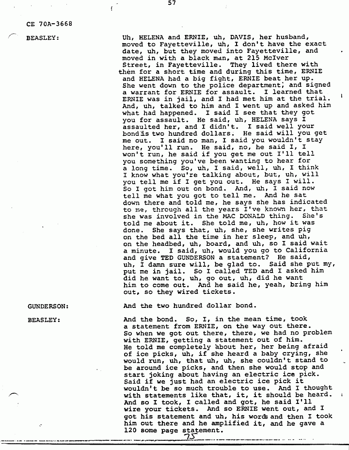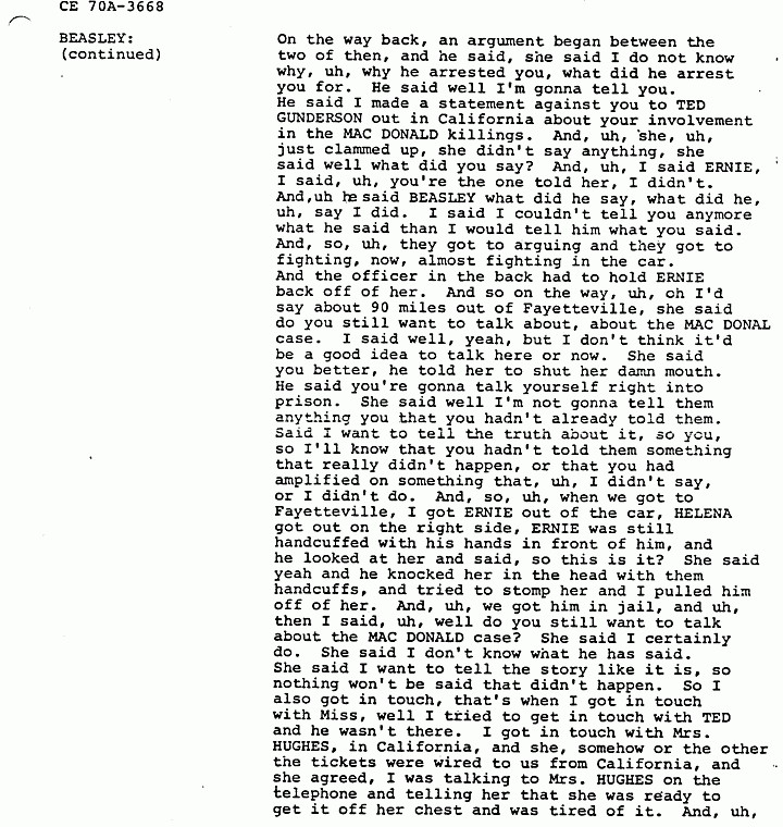 BEASLEY: On tape. He was uh, and he was not, uh, given anything. And then, then he came, when he came back to California, I mean from California, to Fayetteville, he, uh, was supposed to show up in court. I said now if you show up in court, you don't have anything to worry about. I says, uh, uh, I won't be after you, but if you don't show up I'm going after you, because that bond'll have to be forfeited and it have to be paid. So he assured me he was going to show up. Well, he came back to Fayetteville, and he went right straight to, uh, this black man's house. And, uh, got HELENA and told her that the case had been reopened on MACDONALD, that she was in, she was in bad trouble, that they had to leave Fayetteville. And, uh, so when the case came up, I went down to court, the case was not called. I mean it was called and he failed, he didn't show. And, so I, found that, uh, the bond forfeiture had been, uh, issued and I went after him. And, uh, I caught him and uh, HELENA walking together. I got an off duty officer, uh, he wasn't off duty but he was on duty, told him I had him for bond jumping. And, uh, ERNIE and HELENA were walking together down off a little country road there in Seneca. And I pulled up and jumped out and I got ERNIE in the belt. And, uh, I said ERNIE you, uh, didn't show up in court, you did me wrong. And I handcuffed him, put him in the car, and she was standing there looking dumfounded, didn't know what was going on. And so, uh, I, uh, got an officer there in, uh, Walhalla, to accompany me back to Fayetteville with him because, uh, it was a little bit dangerous, I thought, to have him and her in the car at the same time, but, but, at first I didn't think she was going to come back. She said I'll meet you in Fayetteville, I'll hitchhike back. She told me, she said, uh, I, uh, don't know what you got him for, and I don't know what he's done, but I'll find out and I'll go down there and get him out. And I said well if you going to hitchhike back to Fayetteville, I said why don't you ride back with me, I'm going back, And he said no don't do that, don't come back with us, said go and hitch back, hike, hike back. So, uh, I got her in the car and she said I'm going anyway. And the other officer got in with us. We went on down to the police station, and uh, I told him, I says, uh, I'll give you the bond fee to come back with me, and see, and keep him off my back. On the way back, an argument began between the two of them, and he said, she said I do not know why, uh, why he arrested you, what did he arrest you for. He said well I'm gonna tell you. He said I made a statement against you to TED GUNDERSON out in California about your involvement in the MACDONALD killings. And, uh, she, uh, just clammed up, she didn't say anything, she said well what did you say? And, uh, I said ERNIE, I said, uh, you're the one told her, I didn't. And, uh he said BEASLEY what did he say, what did he, uh, say I did. I said I couldn't tell you anymore what he said than I would tell him what you said. And, so, uh, they got to arguing and they got to fighting, now, almost fighting in the car. And the officer in the back had to hold ERNIE back off of her. And so on the way, uh, oh I'd say about 90 miles out of Fayetteville, she said do you still want to talk about, about the MACDONALD case. I said well, yeah, but I don't think it'd be a good idea to talk here or now. She said you better, he told her to shut her damn mouth. He said you're gonna talk yourself right into prison. She said well I'm not gonna tell them anything you that you hadn't already told them. Said I want to tell the truth about it, so you, so I'll know that you hadn't told them something that really didn't happen, or that you had amplified on something that, uh, I didn't say, or I didn't do. And, so, uh, when we got to Fayetteville, I got ERNIE out of the car, HELENA got out on the right side, ERNIE was still handcuffed with his hands in front of him, and he looked at her and said, so this is it? She said yeah and he knocked her in the head with them handcuffs, and tried to stomp her and I pulled him off of her. And, uh, we got him in jail, and uh, then I said, uh, well do you still want to talk about the MACDONALD case? She said I certainly do. She said I don't know what he has said.
