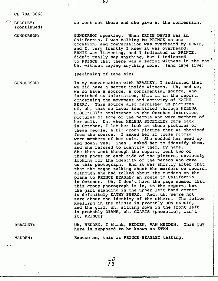 GUNDERSON: In my conversation with BEASLEY, I indicated that we did have a secret inside witness. Uh, and we, we do have a source, a confidential source, who furnished us information, this is in the report, concerning the movement and activity of KATHY PERRY. This source also furnished us pictures of, uh, that we later identified through HELENA STOECKLEY's assistance in the October interview, pictures of some of the people who were members of her cult. Uh, when HELENA STOECKLEY came back in October, I let her look at these pictures of these people, a big group picture that we obtained from the source. I asked her if these people were members of her cult. She nodded her head up and down, yes. Then I asked her to identify them, and she refused to identify them, by name. She then went through the report, went two or three pages on each side of the picture, obviously looking for the identity of the person who gave us this photograph. And it was shortly after that that she began talking about the murders on record, although she had talked about the murders on the plane to PRINCE BEASLEY en route to California in October. Uh, I don't have the page number that this group photograph is in, in the report, but the girl standing in the upper left hand corner is definitely KATHY PERRY. And, uh, we're not sure about the identity of the others. The fellow kneeling in the middle is probably DON HARRIS, and the girl, uh, sitting down in the front left is probably DIANE, uh, CZARIS (phonetic), isn't it, PRINCE?