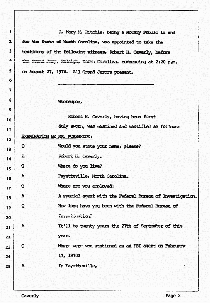 I, Mary M. Ritchie, being a Notary Public in and for the State of North Carolina, was appointed to take the testimony of the following witness, Robert H. Caverly, before the Grand Jury, Raleigh, North Carolina, commencing at 2:20 p.m. on August 27, 1974. All Grand Jurors present.