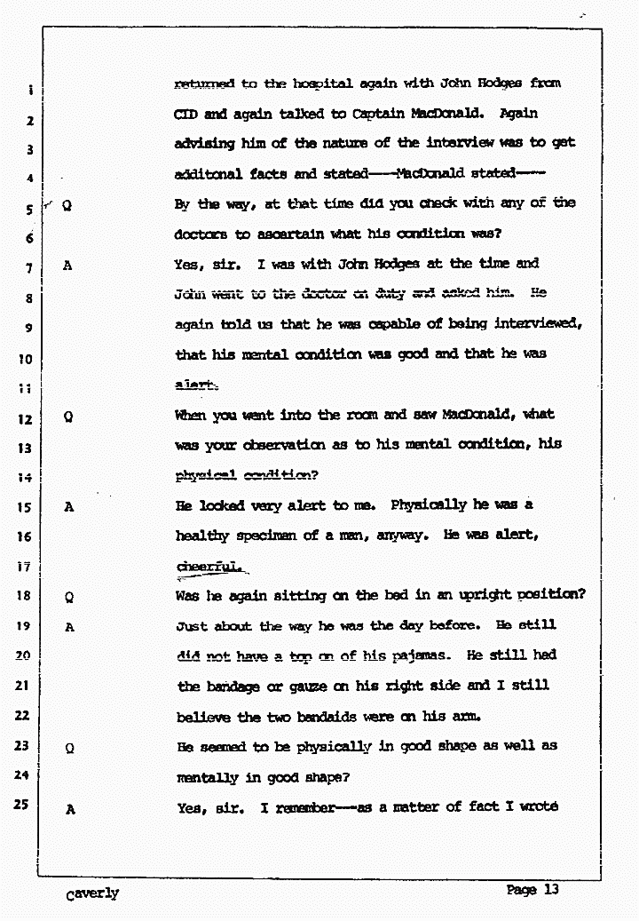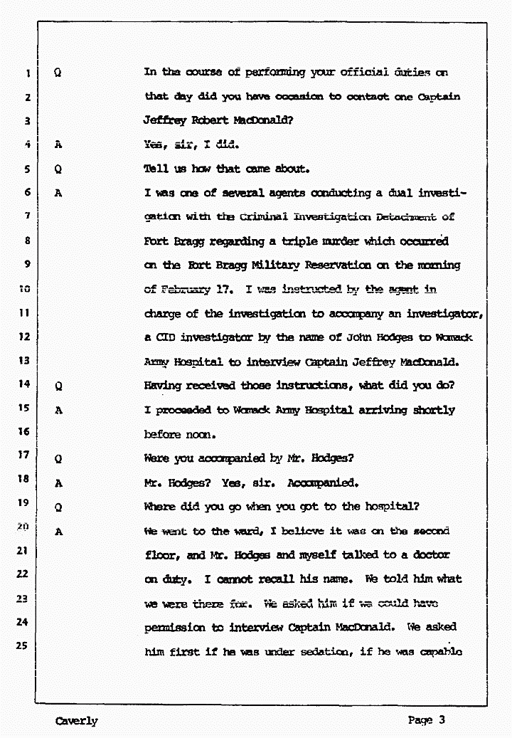 JUROR: I have one. Mr. Caverly, in what rooms of the hospital did you interview Dr. MacDonald? Was this all in the emergency room or --