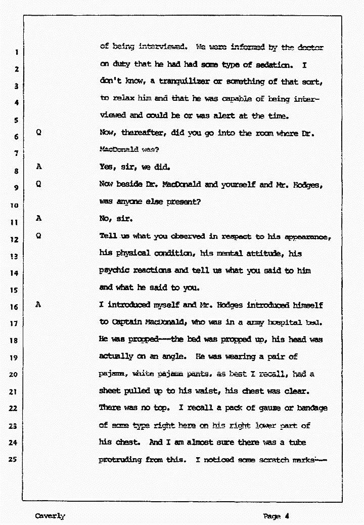 A I introduced myself and Mr. Hodges introduced himself to Captain MacDonald, who was in an Army hospital bed. He was propped -- the bed was propped up, his head was actually on an angle. He was wearing a pair of pajama, white pajama pants, as best I recall, had a sheet pulled up to his waist, his chest was clear. There was no top. I recall a pack of gauze or bandage of some type right here on his right lower part of his chest. And I am almost sure there was a tube protruding from this. I noticed some scratch marks -- what appeared to be scratch marks right up here on the left, almost near the shoulder, right on the upper part of the left breast and two bandaids on his left arm. Dr. MacDonald appeared to me to be calm or to be alert and his physical appearance was one of -- he didn't appear to be sick.