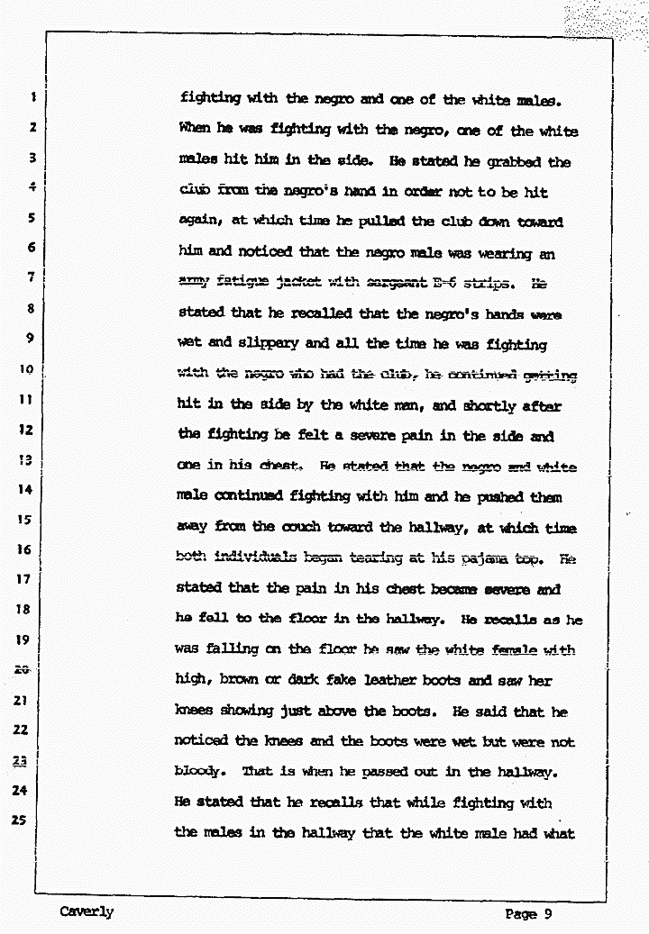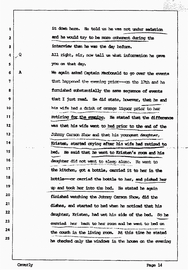 A We identified ourselves and Captain MacDonald agreed to be interviewed even though he said he was under sedation and was emotionally upset over the events incurred against him and his family. He stated on Monday the 16th of February -- the whole purpose of the interview was to get a chronological sequence of events that happened during the preceding day up until the time of MacDonald's injury. He stated that on the 16th of February 1970 he arrived at his residence at about 5:00 - 5:30 p.m. from work after having played basketball with some members of his office which was the headquarters -- the Headquarters Company of the Sixth Special Forces Group of Fort Bragg. He ate his supper and then his wife, Colette, left to attend classes at North Carolina State University Extension at Fort Bragg, North Carolina. He said that after his wife had returned home from school they watched television and shortly before the Johnny Carson Show came on television, which would be 11:30 p.m., his wife took some medication to help her sleep because she was some three to four months pregnant. He stated that he and his wife were laying on the floor watching television when their youngest daughter, Kristen, started to cry. Captain MacDonald stated he went to Kristen's room at which time she stated that she did not want to sleep alone. In the meantime he said his wife, Colette, had gone to bed in the master bedroom. Captain MacDonald stated that he believes he went to the kitchen and got his daughter a bottle of chocolate milk and went back to her room. Stated he then took his daughter to the master bedroom where his wife was in bed and he placed Kristen in the bed next to his wife. Captain MacDonald estimated this to be 12:30 - 12:45 on February 17, 1970. He said that after he put his daughter to bed he returned to the living room and watched television again. He stated that after the Johnny Carson Show was over at 1:00 a.m. he read about fifty pages of a novel, then did the dishes in the kitchen, and stated it was approximately 2:00 - 2:30 when he went to the master bedroom to go to bed and noticed that his daughter had wet his side of the bed. He stated that he picked up his daughter and took her back to her room and he went to the living room where he prepared to go to sleep on the sofa. He believes he finally lay down on the sofa in the living room somewhere around 2:30 a.m. Captain MacDonald stated he was awakened at some unknown time when he heard his wife screaming, "Jeff, Jeff, help me. Jeff, why are they doing this to me." He said that at about the same time he heard his oldest daughter, Kimberly, scream "Daddy, daddy, daddy" over and over again. He said he sat up on the couch on his elbows at which time he saw some people standing at the foot of the couch. There was one Negro on the far left walking toward him. He observed two white males at the foot of the couch, and then he observed a white male moving to the side at which time he saw a white female standing behind the two men holding what appeared to him to be a lighted candle in her hands in front of her body. He stated before he could say anything the Negro male was next to him with a club in both hands raised over his head. He stated he raised his hands and arms to defend himself and was hit on the arm and across the forehead. He recalls -- at this time he said he recalls that just before he was hit on the forehead he heard the white female chanting in a monotone voice "Kill the pigs, acid and rain are groovy man, acid is groovy." He stated he was then hit on the forehead and fell back on the couch which at the same time the white female was continuing her monotone chanting. Captain MacDonald stated he began fighting with the Negro and one of the white males. When he was fighting with the Negro, one of the white males hit him in the side. He stated he grabbed the club from the Negro's hand in order not to be hit again, at which time he pulled the club down toward him and noticed that the Negro male was wearing an army fatigue jacket with sergeant E-6 stripes. He stated that he recalled that the Negro's hands were wet and slippery and all the time he was fighting with the Negro who had the club, he continued getting hit in the side by the white men, and shortly after the fighting he felt a severe pain in the side and one in his chest. He stated that the Negro and white male continued fighting with him and he pushed them away from the couch toward the hallway, at which time both individuals begain tearing at his pajama top. He stated that the pain in his chest became severe and he fell to the floor in the hallway. He recalls as he was falling on the floor he saw the white female with high, brown or dark fake leather boots and saw her knees showing just above the boots. He said that he noticed the knees and the boots were wet but were not bloody. That is when he passed out in the hallway. He stated that he recalls that while fighting with the males in the hallway that the white male had what appeared to be a knife or an ice pick in his hand. He stated he observed the shiny blade but could not say what type instrument it was. Captain MacDonald stated that he does not know how long or did not know how long he was unconscious, but when he was awake -- when he awoke he was on the floor with his pajama tops bloody and torn and twisted around his wrist. He stated he got up from the floor and went into Kimberly's room and saw blood all over the bed. He felt her heart and pulse but could find no life. He then went to Kristen's bedroom and found the same thing and he found no pulse or heart beat. Captain MacDonald stated that he used the telephone in the bedroom and called the Fayetteville telephone operator and said that "I need an ambulance and MPs at 544 Castle Drive." He said the operator started asking him questions such as his social security number, the reason for the ambulance, at which time he laid the telephone down and returned to the daughters