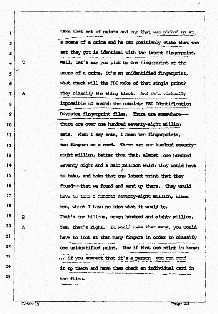 A They classify the thing first. And it's virtually impossible to search the complete FBI Identification Division fingerprint files. There are somewhere -- there are over one hundred seventy-eight million sets. When I say sets, I mean ten fingerprints, ten fingers on a card. There are one hundred seventy-eight million, better than that, almost one hudred seventy-eight and a half million which they would have to take, and take that one latent print that they found -- that we found and send up there. They would have to take a hundred seventy-eight million, times ten, which I have no idea what it would be.