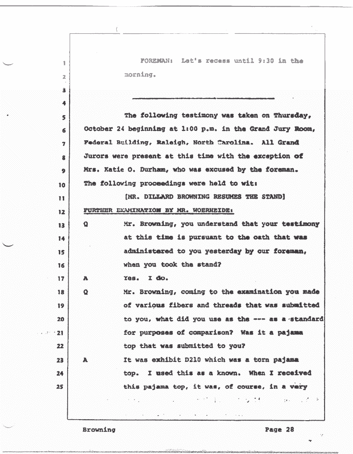 The following testimony was taken on Thursday, October 24, beginning at 1:00 p.m. in the Grand Jury Room, Federal Building, Raleigh, North Carolina. All Grand Jurors were present at this time with the exception of Mrs. Katie O. Durham, who was excused by the foreman. The following proceedings were held to wit: