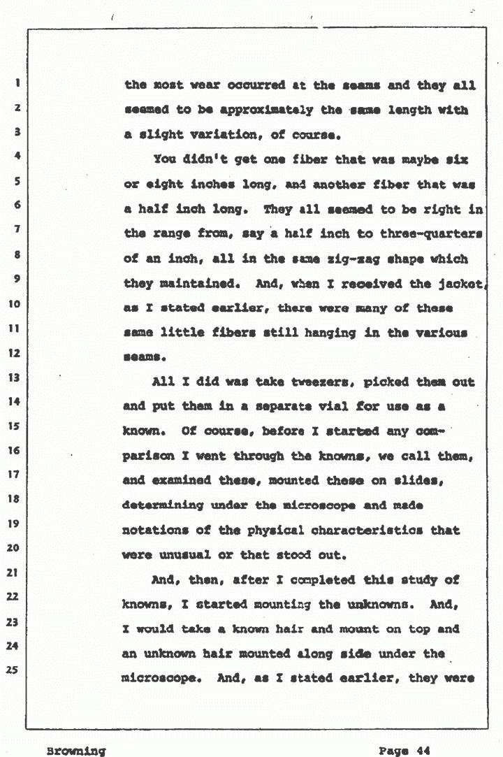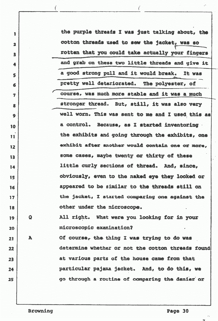 This thread, I called it purple, was actually, I'm sure, at one time blue. But when the blue color is subjected to bleaching and such, quite often it takes on a bluish-purple appearance. This was apparently what had happened in this case. The seams that were ripped -- it ripped into hundreds of little curly fibers of thread. The seams were sewn with a criss-crossed type of sewing action. And when the seams are ripped, these little criss-crosses in sections, I would say if you straightened them out, I'd say they would be three-quarters, maybe, of an inch long, each. And these were -- many of them still adhering in the seams to the jacket, itself. I removed some of these for controls. The body part was a polyester cotton blend and it seemed to be more, had more strength, or be more substantial. Incidentally, the threads, the purple threads I was just talking about, the cotton threads used to sew the jacket, was so rotten that you could take actually your fingers and grab on these two little threads and give it a good strong pull and it would break. It was pretty well deteriorated. The polyester, of course, was much more stable and it was a much stronger thread. But still, it was also very well worn. This was sent to me and I used this as a control. Because, as I started inventoring the exhibits and going through the exhibits, one exhibit after another would contain one or more, some cases, maybe twenty or thirty of these little curly sections of thread. And since, obviously, even to the naked eye they looked or appeared to be similar to the threads still on the jacket, I started comparing one against the other under the microscope.
