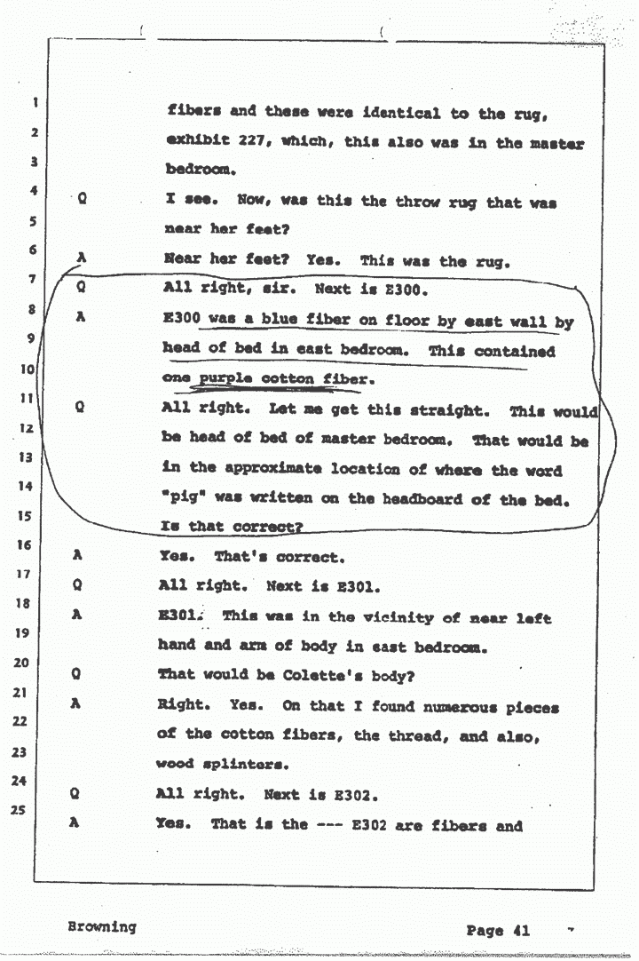FOREMAN: There was blood on the fibers in Kimberly's room. I believe you stated there was blood on those fibers. But you said you didn't do any of the blood work, so I'll skip over that.