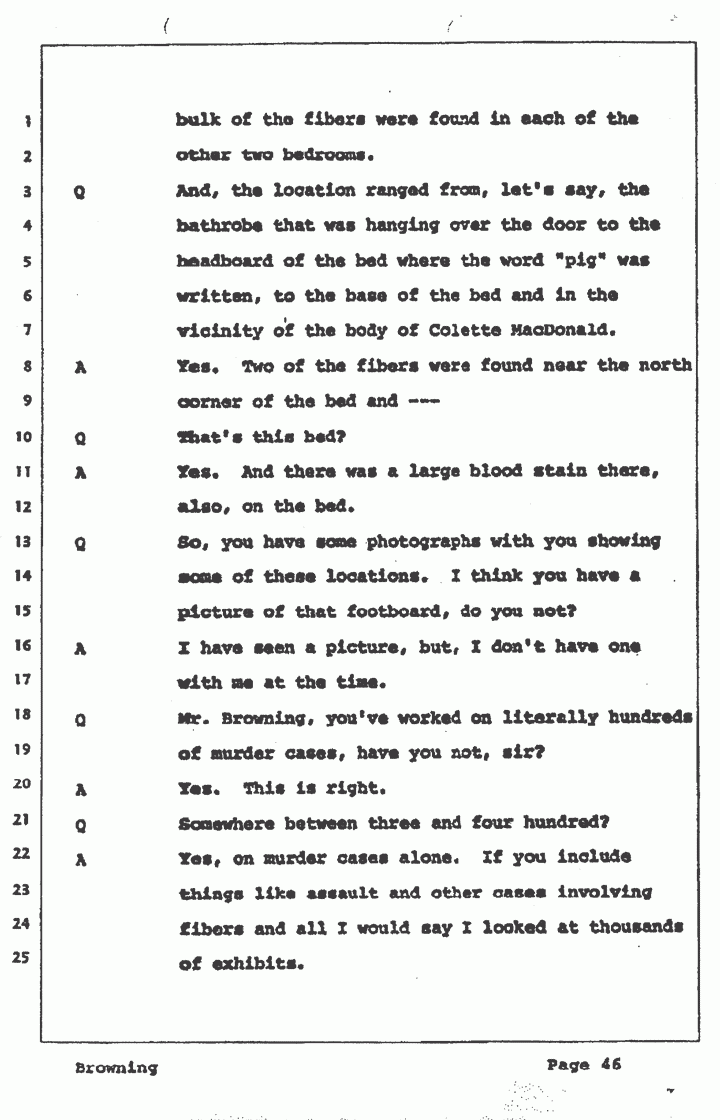 But other than that, we care nothing about the details, and whenever we get a detail, it's always long after the exam is completed and the case is coming to trial or this type thing. So, at the time we made these notes, for instance, which was right after the murder, and, at the time, up until the trial, we obviously read more in the newspaper and heard more, then we can put the case together a little bit, form some conclusions on your own. But, up until that time, you just merely work the exhibits. I noticed several of the fibers were found near the headboard, I believe, of the bed in the master bedroom, and they were found near a bloodstain on the footboard. The fibers seemed to be pretty well distributed throughout those three rooms where the action took place, where the people were stabbed or hurt or something. Many of the fibers were in positions that indicated they were there during or before the time that it occurred. There were some, of course, found on the floor, on top of the bedspread, could have occurred after the action. But, when you found the fibers underneath the covers and underneath the bodies, it indicates to me that it was possibly there before the children were killed.