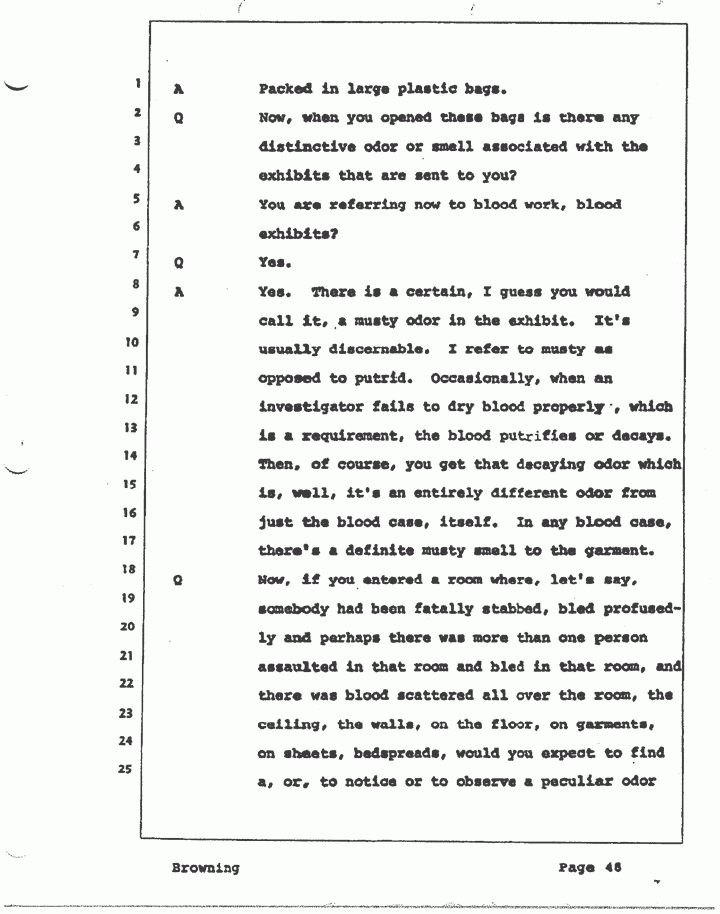 Q Now, if you entered a room where, let's say, somebody had been fatally stabbed, bled profusely and perhaps there was more than one person assaulted in that room and bled in that room, and there was blood scattered all over the room, the ceiling, the walls, on the floor, on garments, on sheets, bedspreads, would you expect to find a -- or to notice, or to observe, a peculiar odor?