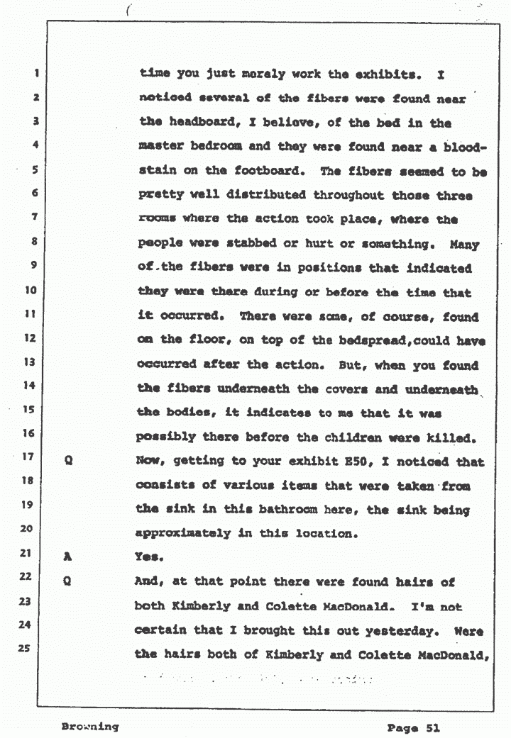 Q And at that point there were found hairs of both Kimberly and Colette MacDonald. I'm not certain that I brought this out yesterday. Were the hairs of both Kimberly and Colette MacDonald, as found in the sink, bloodstained? Or the wash basin, I should say, rather than the sink?