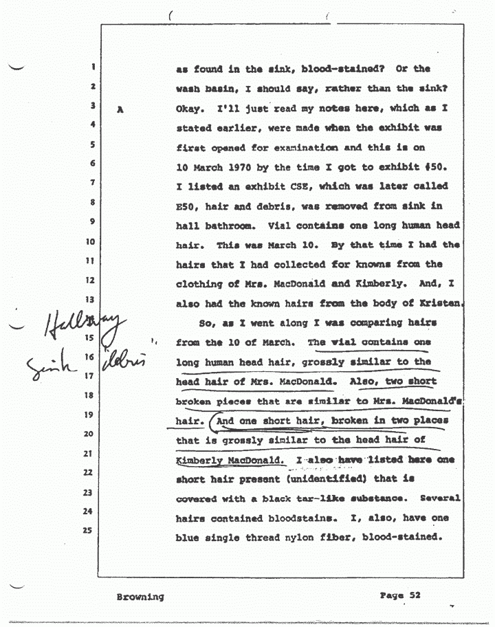 A Okay. I'll just read my notes here, which, as I stated earlier, were made when the exhibit was first opened for examination and this is on 10 March 1970 by the time I got to exhibit #50. I listed an exhibit CSE, which was later called E50, hair and debris, was removed from sink in hall bathroom. Vial contains one long human head hair. This was March 10. By that time, I had the hairs that I had collected for knowns from the clothing of Mrs. MacDonald and Kimberly. And I also had the known hairs from the body of Kristen.