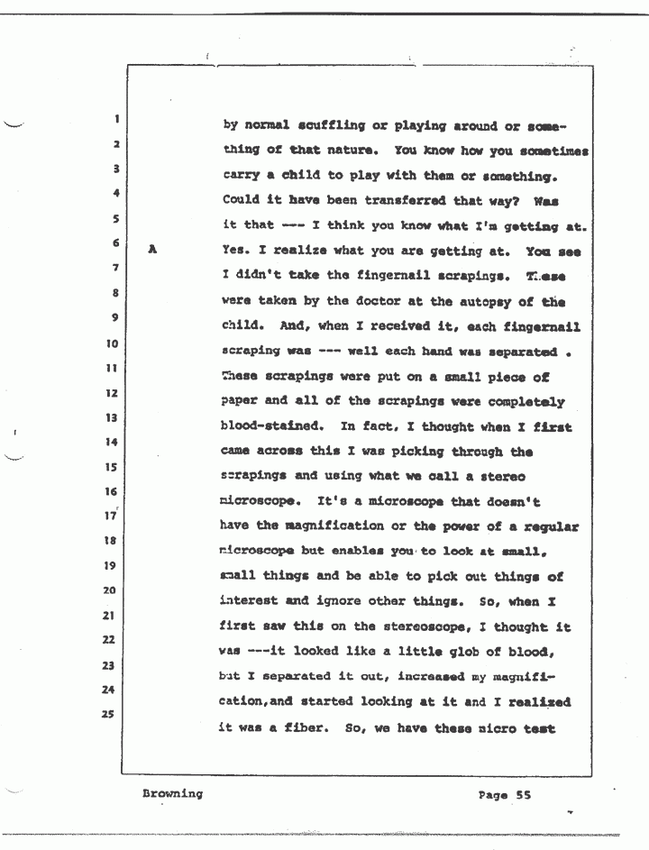 A Yes. I realize what you're getting at. You see, I didn't take the fingernail scrapings. These were taken by the doctor at the autopsy of the child. And when I received it, each fingernail scraping was -- well, each hand was separated. These scrapings were put on a small piece of paper and all of the scrapings were completely bloodstained. In fact, I thought when I first came across this -- I was picking through the scrapings and using what we call a stereo microscope. It's a microscope that doesn't have the magnification or the power of a regular microscope but enables you to look at small, small things and be able to pick out things of interest and ignore other things. So, when I first saw this on the stereoscope, I thought it was -- it looked like a little glob of blood, but I separated it out, increased my magnification, and started looking at it, and I realized it was a fiber. So, we have these micro test tubes and I carefully washed it, removed the blood and all from it, because it was so bloodstained that even -- there was no way I could examine it under a microscope without cleaning it up first. So, I cleaned it up. I washed it with saline and with soapy water first and then rinsed it with water, mounted it on a slide and examined it under a microscope. It was then that I determined it was from the pajama jacket of Captain MacDonald's. Now, how it could have gotten there and be bloodstained and blood-soaked at the same time it would -- well, my personal opinion is that it would be pretty hard to do.