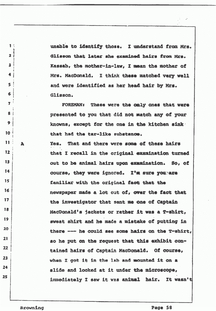 A I believe this is the hair -- I was on leave, I took a week's vacation, and was on leave when the hair came in from Captain MacDonald, and so Mrs. Glisson ran this. Prior to this time, I had been doing all of the hair work. Mrs. Glisson compared the main hairs from Captain MacDonald and this unknown hair. And I think she said from the point present that what she had to compare, that there wasn't enough to identify it as being -- I'm sure you have that report. I'm not sure exactly what the report did say. But I knew she could not say it was Captain MacDonald's hair.