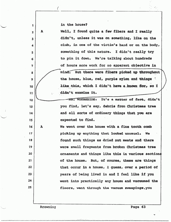 A Well, I found quite a few fibers and I really didn't unless it was on something, like on the club, in one of the victim's hand or on the body, something of this nature. I didn't really try to pin it down. We're talking about hundreds of hours more work for no apparent objective in mind. But there were fibers picked up throughout the house, blue, red, purple nylon and things like this, which I didn't have a known for, so I didn't examine it.