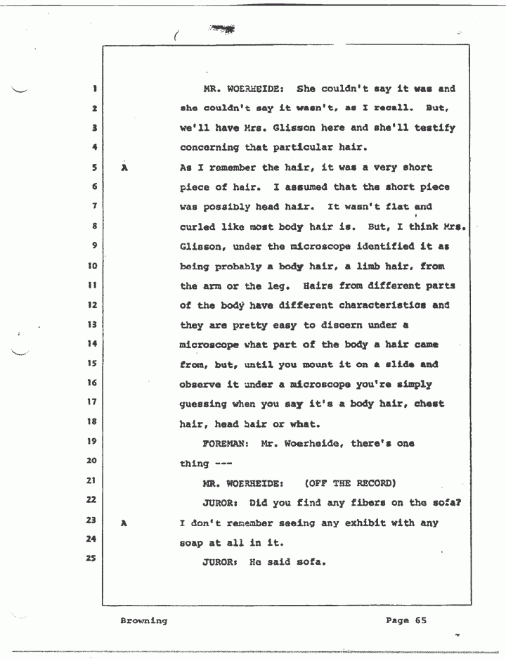 MR. WOERHEIDE: She couldn't say it was and she couldn't say it wasn't, as I recall. But we'll have Mrs. Glisson here and she'll testify concerning that particular hair.