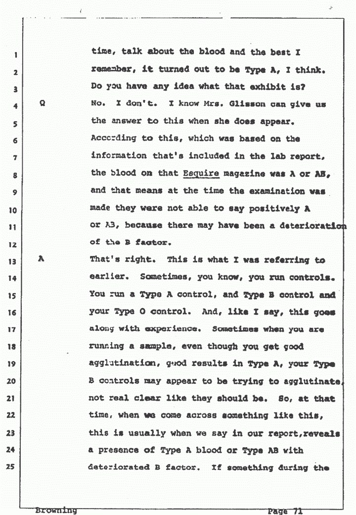 Q No, I don't. I know Mrs. Glisson can give us the answer to this when she does appear. According to this, which was based on the information that's included in the lab report, the blood on that Esquire magazine was A or AB, and that means at the time the examination was made they were not able to say positively A or AB, because there may have been a deterioration of the B factor.