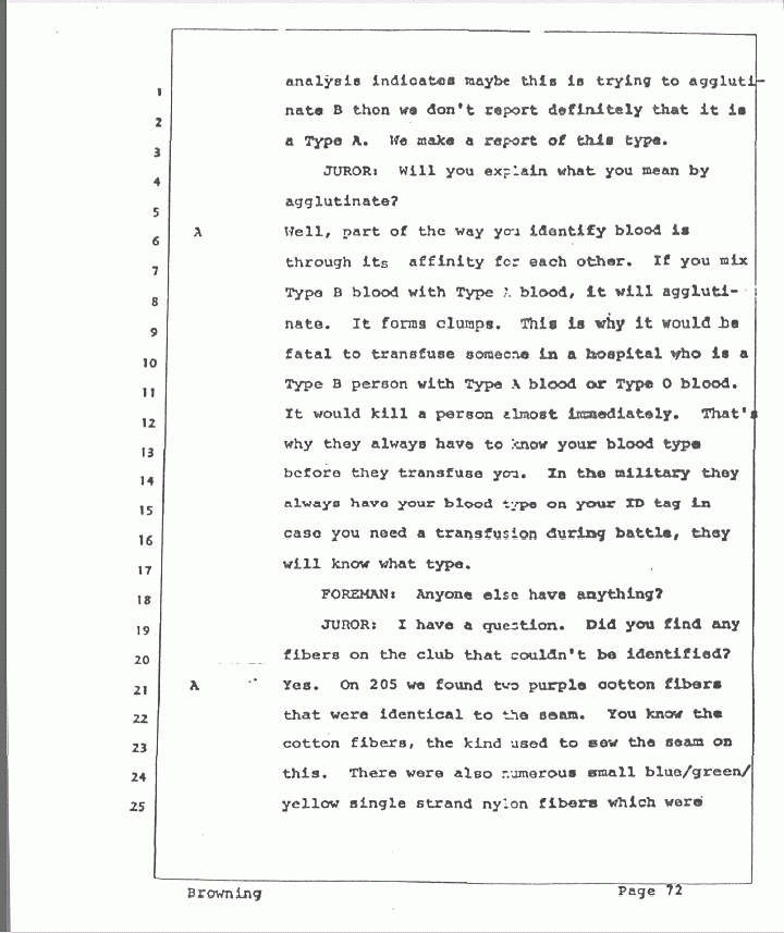 JUROR: I have a question. Did you find any fibers on the club that couldn't be identified?